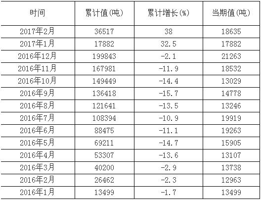 據(jù)數(shù)據(jù)庫數(shù)據(jù)顯示,2017年1-2月我國鈦白粉進(jìn)口量累計(jì)36517噸,同比增長38%,其中2月進(jìn)口量為18635噸。