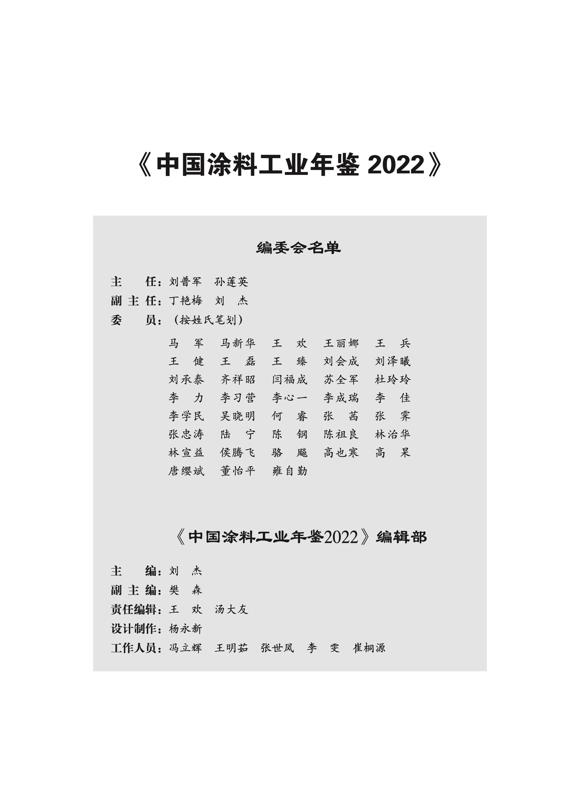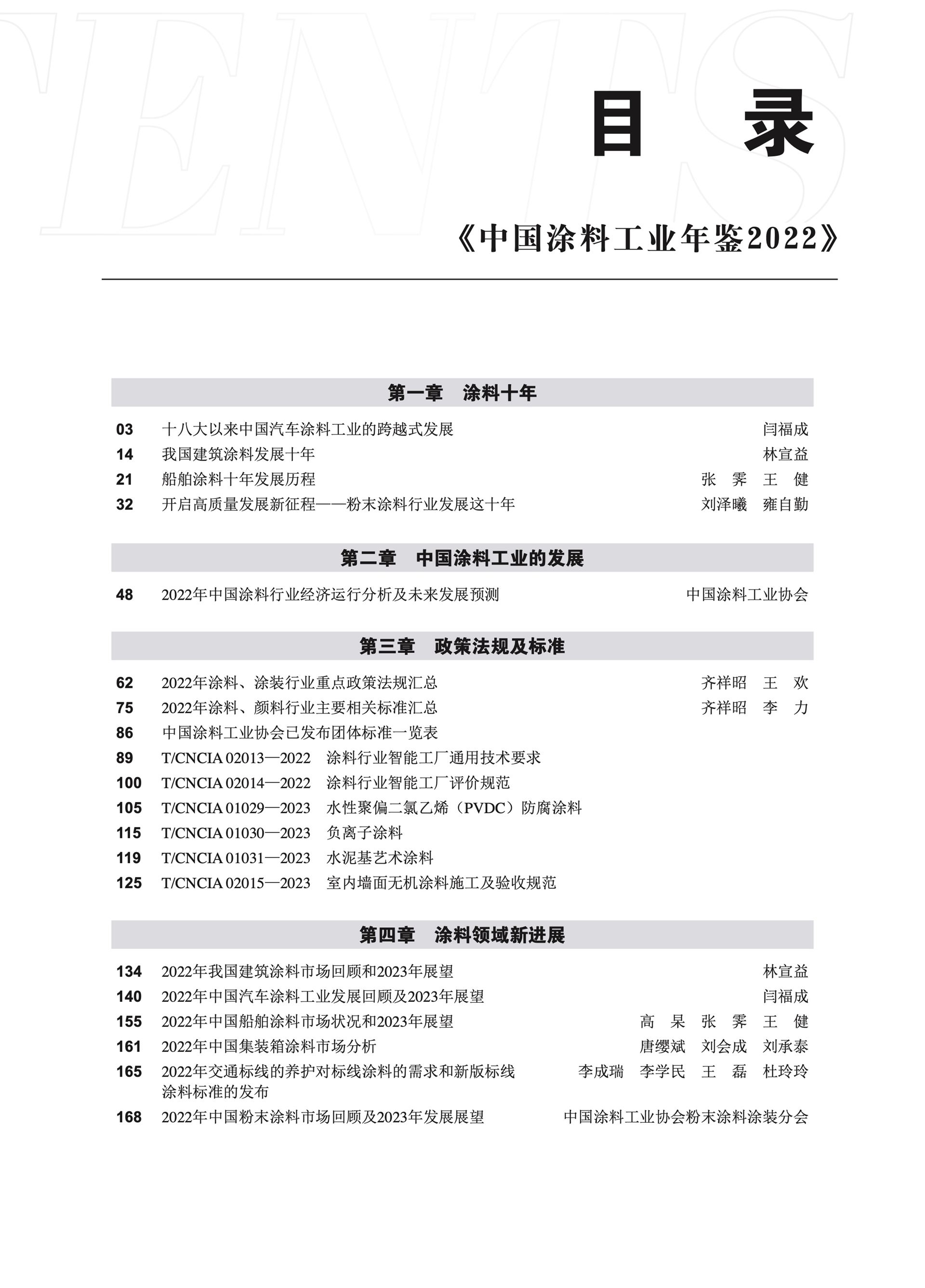 《中國涂料工業(yè)年鑒2022》的編撰出版,內(nèi)容翔實(shí),實(shí)用性強(qiáng)。共分9個(gè)章節(jié)。回顧總結(jié)了十八大以來中國涂料行業(yè)主要涂料領(lǐng)域的十年發(fā)展,梳理了2022年中國涂料工業(yè)經(jīng)濟(jì)運(yùn)行現(xiàn)狀,收錄了2022年度與涂料和顏料行業(yè)相關(guān)的政策法規(guī)及標(biāo)準(zhǔn),整理了國內(nèi)主要地區(qū)的涂料工業(yè)運(yùn)行現(xiàn)狀,以及全球不同涂料領(lǐng)域市場(chǎng)發(fā)展?fàn)顩r,總結(jié)了我國主要涂料領(lǐng)域、涂料用原材料工業(yè)的新進(jìn)展和市場(chǎng)走勢(shì),記錄了2022年我國涂料行業(yè)經(jīng)歷的重要事件,收集整理了涂料和顏料及下游行業(yè)數(shù)據(jù)等。