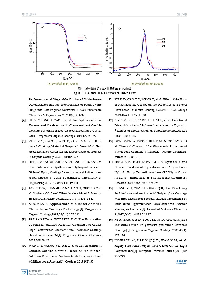 摘要:介紹了一種無溶劑法制備菜籽油基邁克爾加成涂層,以菜籽油、2–巰基乙醇、乙酰乙酸叔丁酯為原料,通過巰基“點擊”反應和酯交換反應制備乙酰乙酸酯菜籽油,并和多官能度丙烯酸酯反應(Michael加成反應)制備涂層。通過動態熱機械分析、熱重力分析和差分掃描熱量法,對所得涂層的機械性能和熱力學性能進行研究。結果表明,隨著涂層交聯密度的增加,涂層的機械性能、熱穩定性增加。