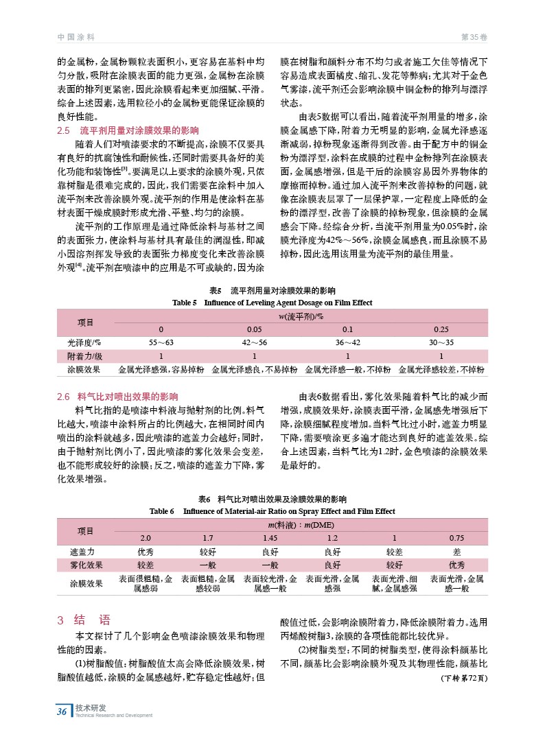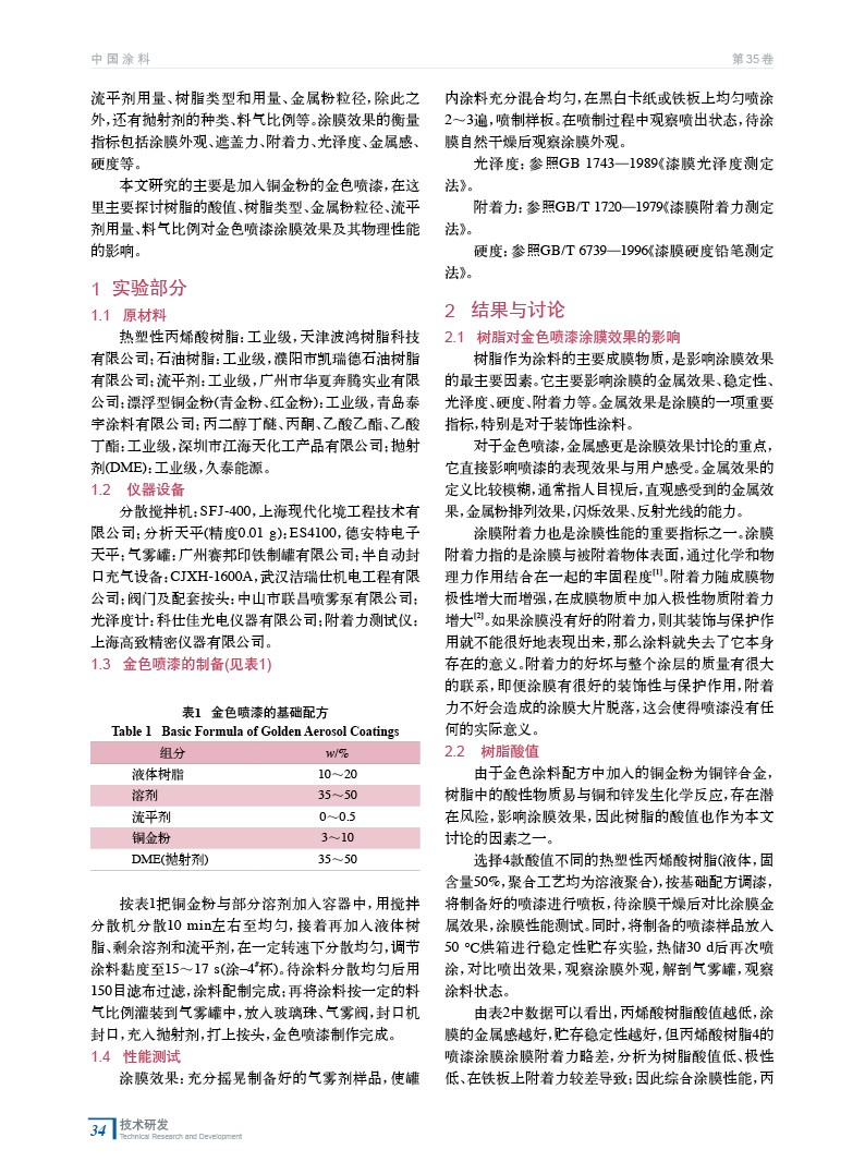 與普通色噴漆相比,加入金屬顏料的噴漆能夠呈現出良好的金屬效果,涂膜金屬質感強,具有較好的裝飾效果。主要研究以銅金粉顏料為主的金色氣霧型噴漆,對比分析樹脂的酸值、樹脂類型、金屬粉粒徑、流平劑用量、料氣比對金色噴漆噴涂效果的影響。