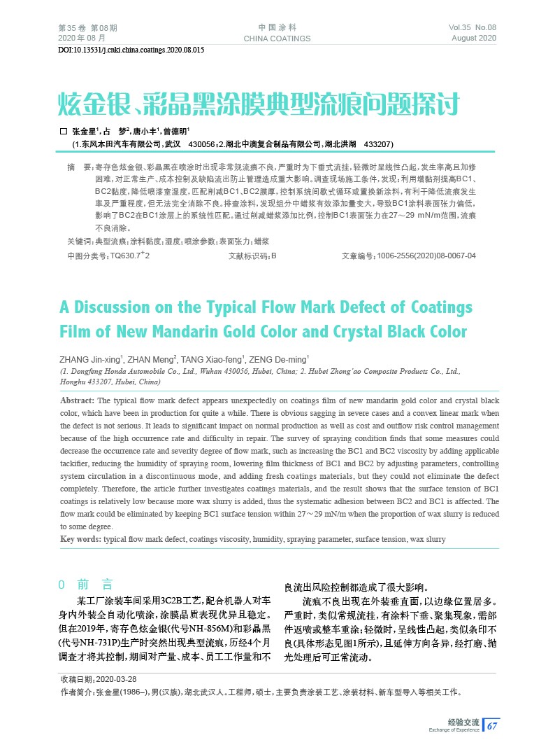摘要:寄存色炫金銀、彩晶黑在噴涂時出現(xiàn)非常規(guī)流痕不良,調(diào)查現(xiàn)場施工條件,發(fā)現(xiàn):利用增黏劑提高BC1、BC2黏度,降低噴漆室濕度,匹配削減BC1、BC2膜厚,控制系統(tǒng)間歇式循環(huán)或置換新涂料,有利于降低流痕發(fā)生率及嚴(yán)重程度,但無法完全消除不良。排查涂料,通過削減蠟漿添加比例,控制BC1表面張力在27~29 mN/m范圍,流痕不良消除。