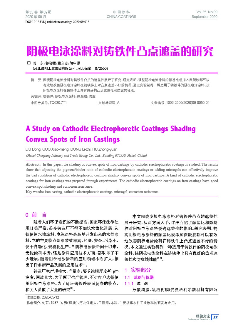 摘要:圍繞陰極電泳涂料對(duì)鑄鐵件凸點(diǎn)的遮蓋性展開了研究。研究表明,調(diào)整陰極電泳涂料的顏基比或加入微凝膠都可以有效地改善陰極電泳涂料在鑄鐵件上對(duì)凸點(diǎn)遮蓋不好的情況。通過實(shí)驗(yàn)制得一種適用于鑄鐵件的陰極電泳涂料。該陰極電泳涂料在鑄鐵件上具有良好的凸點(diǎn)遮蓋性和防腐蝕性能。