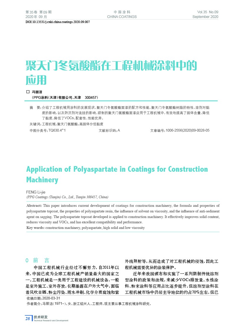 摘要:介紹了工程機(jī)械用涂料的發(fā)展現(xiàn)狀,聚天門(mén)冬氨酸酯面漆的配方和性能,聚天門(mén)冬氨酸酯樹(shù)脂的特性,溶劑對(duì)黏度的影響,以及防沉劑對(duì)流掛的影響。研制的聚天門(mén)氨酸酯面漆應(yīng)用于工程機(jī)械中,有效地提高了固體含量,降低了黏度,降低了VOCs,配套性、性能優(yōu)異。