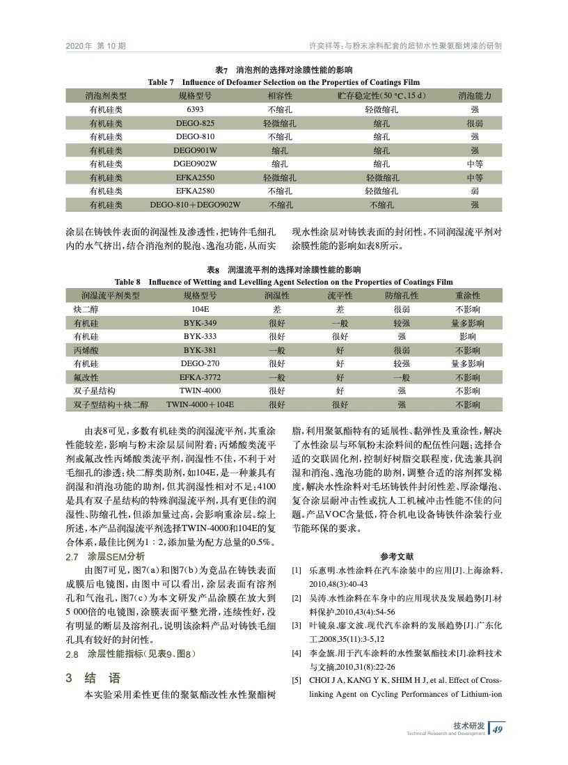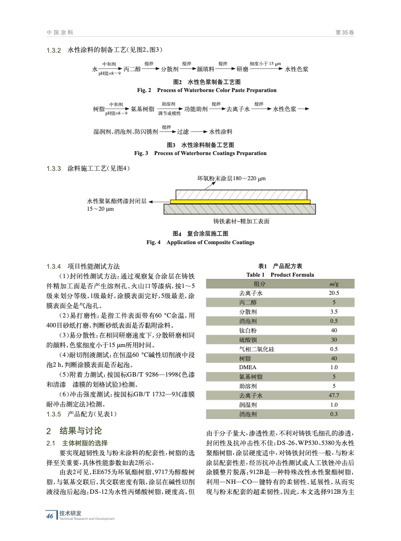 摘要:介紹了一種應(yīng)用于機(jī)電鑄鐵件的水性聚氨酯封閉烤漆,實現(xiàn)了與粉末涂料涂層的配套,重點闡述了該涂料的制備工藝,探討了各種樹脂與固化劑的搭配、功能助劑、助溶劑對涂膜性能及配套性的影響。通過電鏡分析對比,產(chǎn)品對鑄鐵毛細(xì)孔封閉性佳,有效解決了水性涂層與粉末涂層的厚涂涂裝爆泡難題及柔韌性問題。