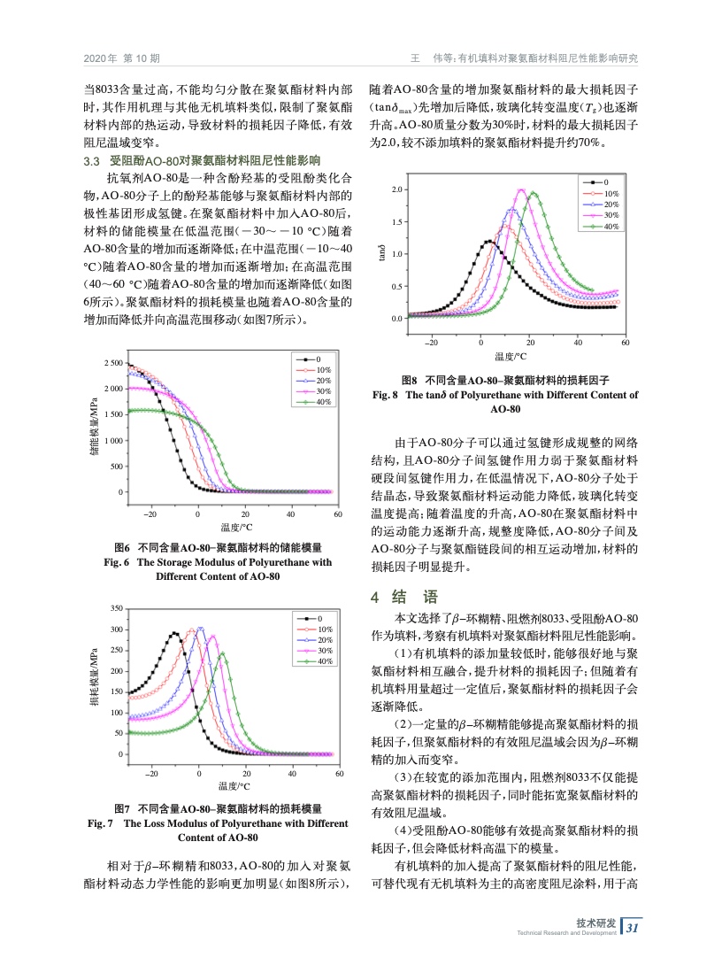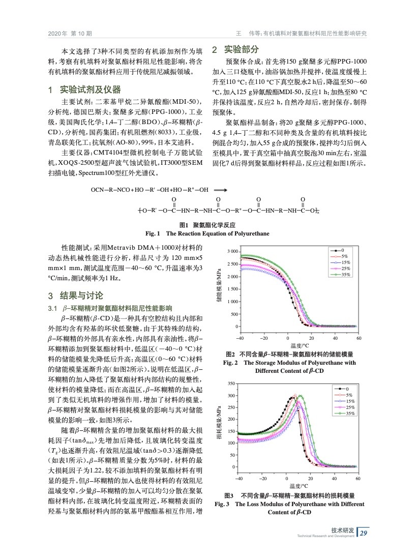摘要:通過在聚氨酯材料中加入β−環糊精、阻燃劑8033、受阻酚AO-80等有機填料,并測試材料的動態力學性能,考察有機填料種類及用量對聚氨酯材料阻尼性能影響。β−環糊精的加入能夠提高聚氨酯材料的損耗因子,但會降低材料的有效阻尼溫域;阻燃劑8033不僅能提高聚氨酯材料的損耗因子,還能拓寬材料的有效阻尼溫域;受阻酚AO-80能夠有效提高聚氨酯材料的損耗因子。