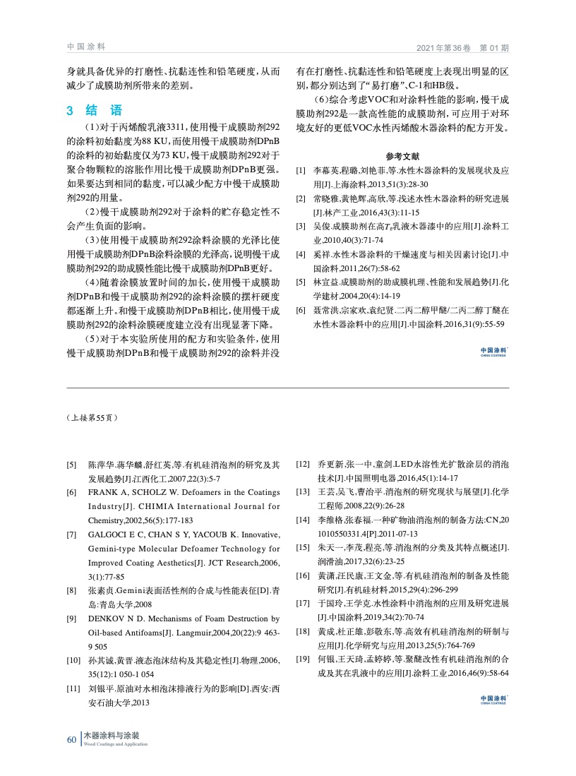 摘要:研究了高沸點成膜助劑在水性丙烯酸木器涂料中的應用,測試結果表明,該成膜助劑對于聚合物顆粒的溶脹作用比DPnB更強,不影響涂料的貯存穩(wěn)定性,涂膜光澤高,隨放置時間的加長,涂膜的擺桿硬度逐漸上升且涂膜硬度建立沒有出現(xiàn)顯著下降,二者的涂膜在打磨性、抗黏連性和鉛筆硬度上未表現(xiàn)出明顯區(qū)別。