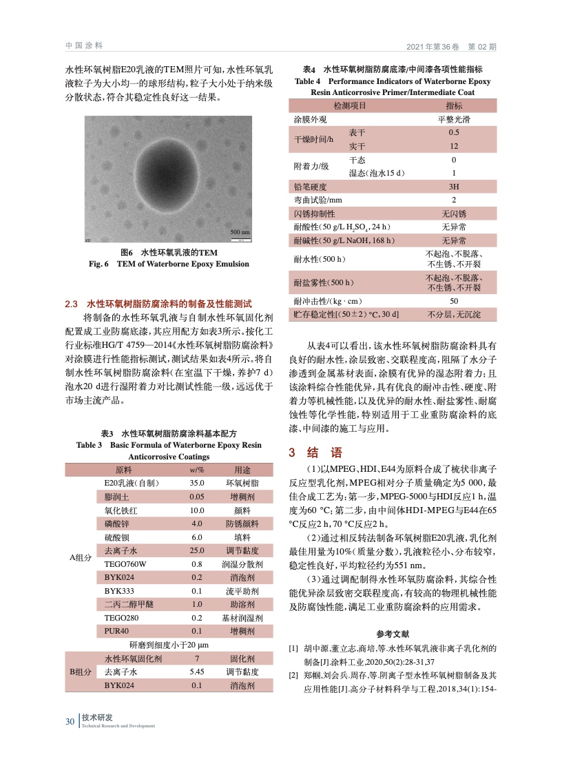 摘要:以聚乙二醇單甲醚、六亞甲基二異氰酸酯、環(huán)氧樹脂為原料合成了一種非離子反應(yīng)型環(huán)氧乳化劑,并通過相反轉(zhuǎn)法制備水性環(huán)氧樹脂E20乳液。對乳化劑結(jié)構(gòu)和乳液形貌及其粒徑分布進(jìn)行表征。確定了乳化劑采用兩步法合成,反應(yīng)溫度為逐步升溫模式,MPEG相對分子質(zhì)量為5 000,乳化劑質(zhì)量分?jǐn)?shù)為10%,所制得的水性環(huán)氧樹脂E20乳液平均粒徑為551 nm,穩(wěn)定性良好,且制得的乳液涂膜固化物具有優(yōu)良的耐水防腐蝕性能。
