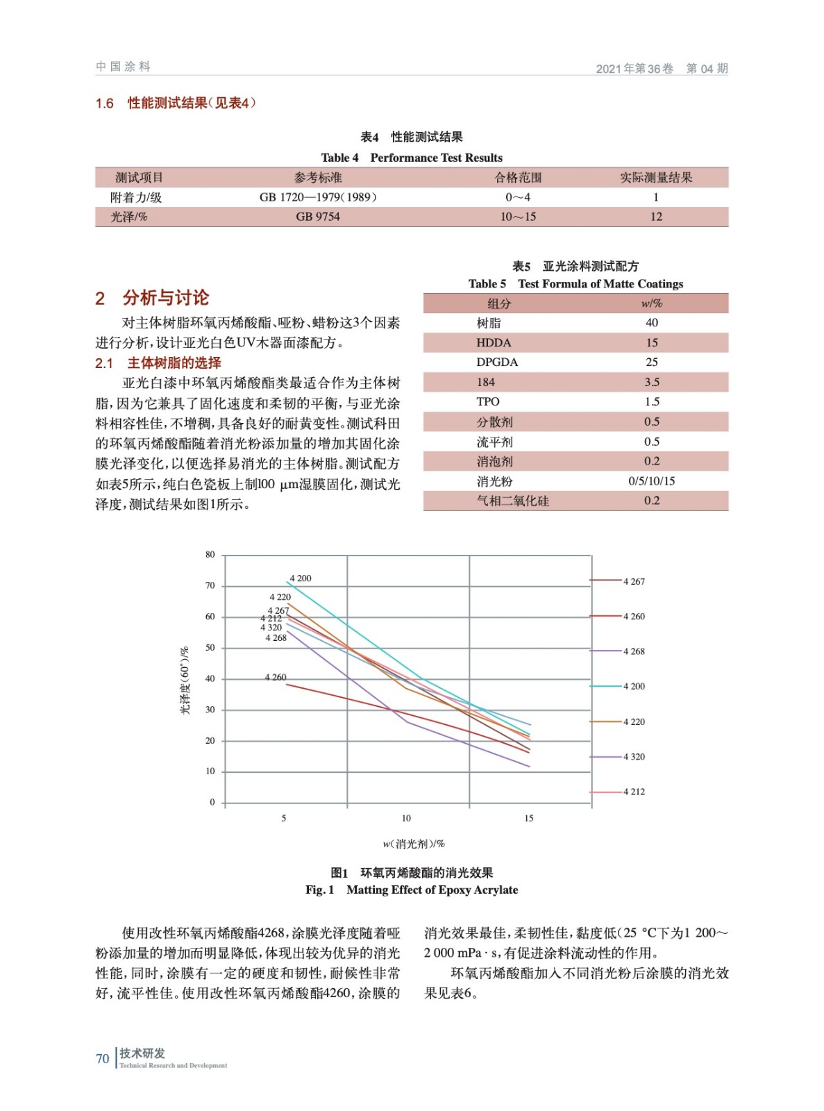 以環氧丙烯酸酯為主體樹脂,討論了環氧丙烯酸酯、啞粉、蠟粉對亞光白面漆性能的影響,最終獲得了木器亞光白色UV面漆的配方設計最佳方案及涂裝方法。涂裝效果證實,本實驗制備的白色UV面漆表面消光效果好、手感好、遮蓋力好,有較強的實用價值。