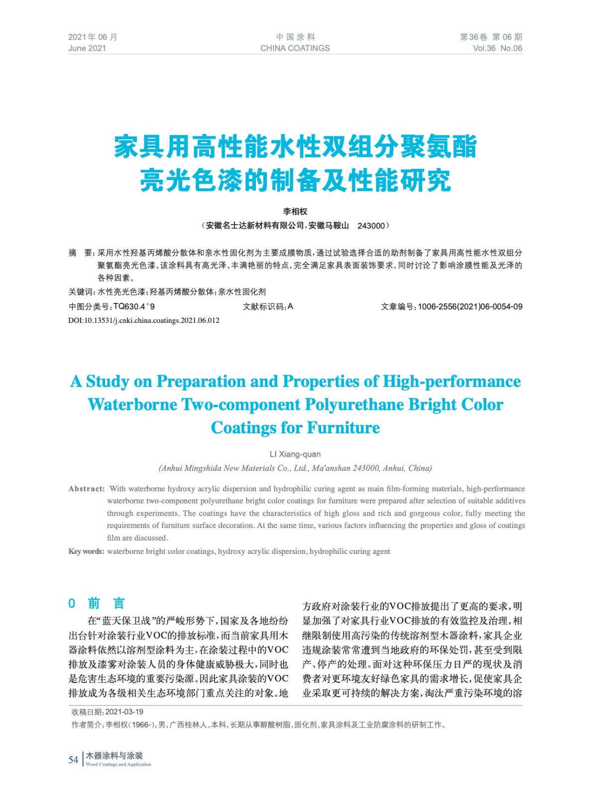 家具用高性能水性雙組分聚氨酯亮光色漆的制備及性能研究