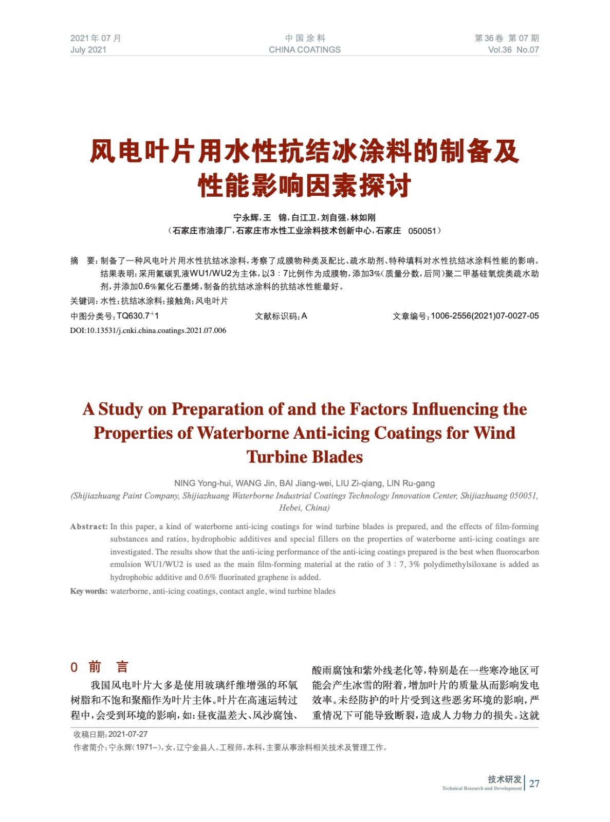 風(fēng)電葉片用水性抗結(jié)冰涂料的制備及性能影響因素探討
