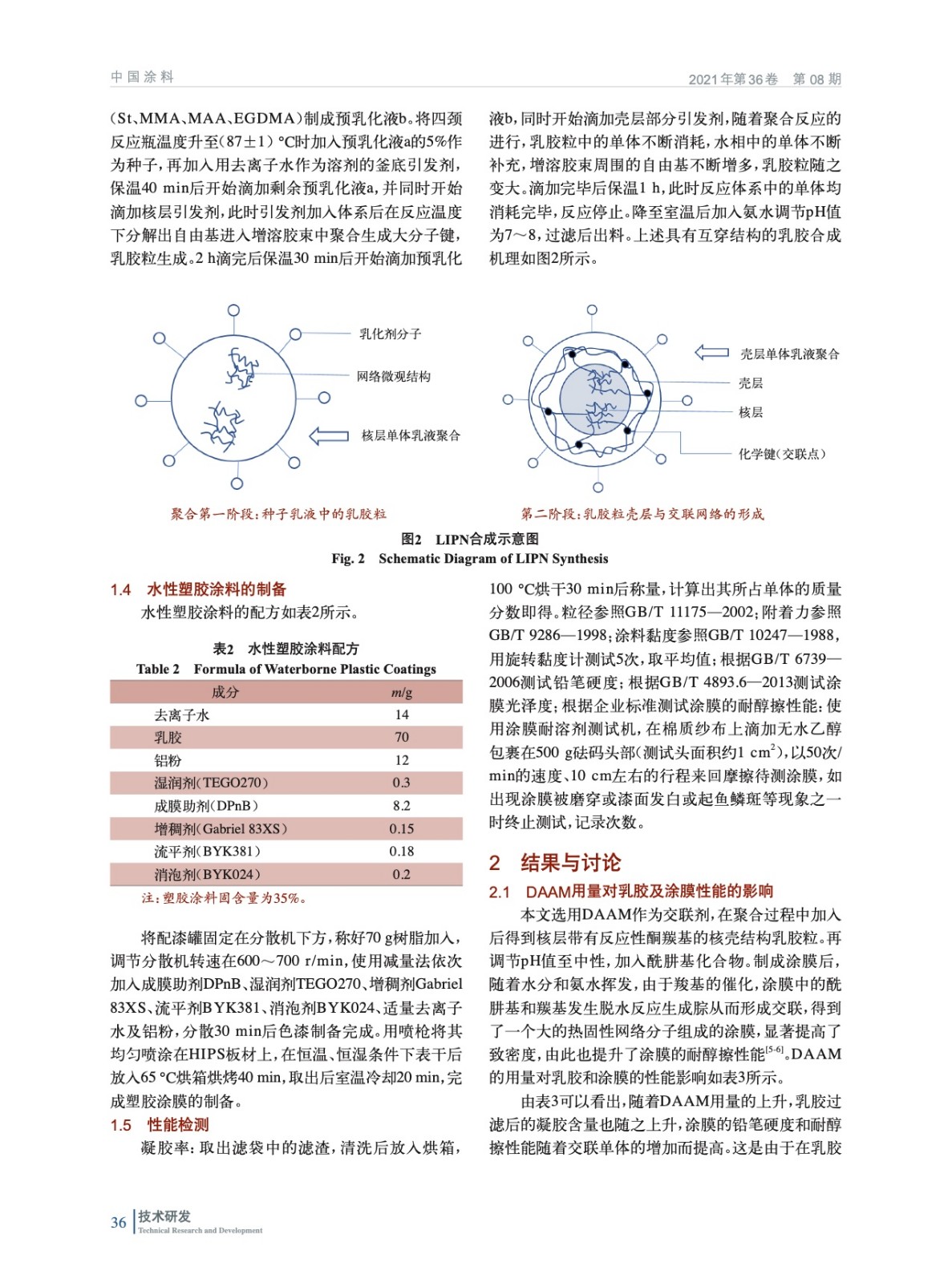 摘要:采用了半連續(xù)種子乳液聚合工藝制備了一種具有乳膠互穿聚合物網(wǎng)絡(luò)結(jié)構(gòu)的核殼型丙烯酸酯乳膠,使用該乳膠配制的塑膠涂料在高抗沖擊性聚苯乙烯板材上具有優(yōu)異附著力和耐乙醇擦拭性能。由實(shí)驗(yàn)可知,當(dāng)核層交聯(lián)單體雙丙酮丙烯酰胺用量為3%,殼層交聯(lián)單體二甲基丙烯酸乙二醇酯用量為2%,乳化劑用量2%,選擇甲基丙烯酸作為極性單體并且用量為3%時(shí),所制得的乳膠性能良好。