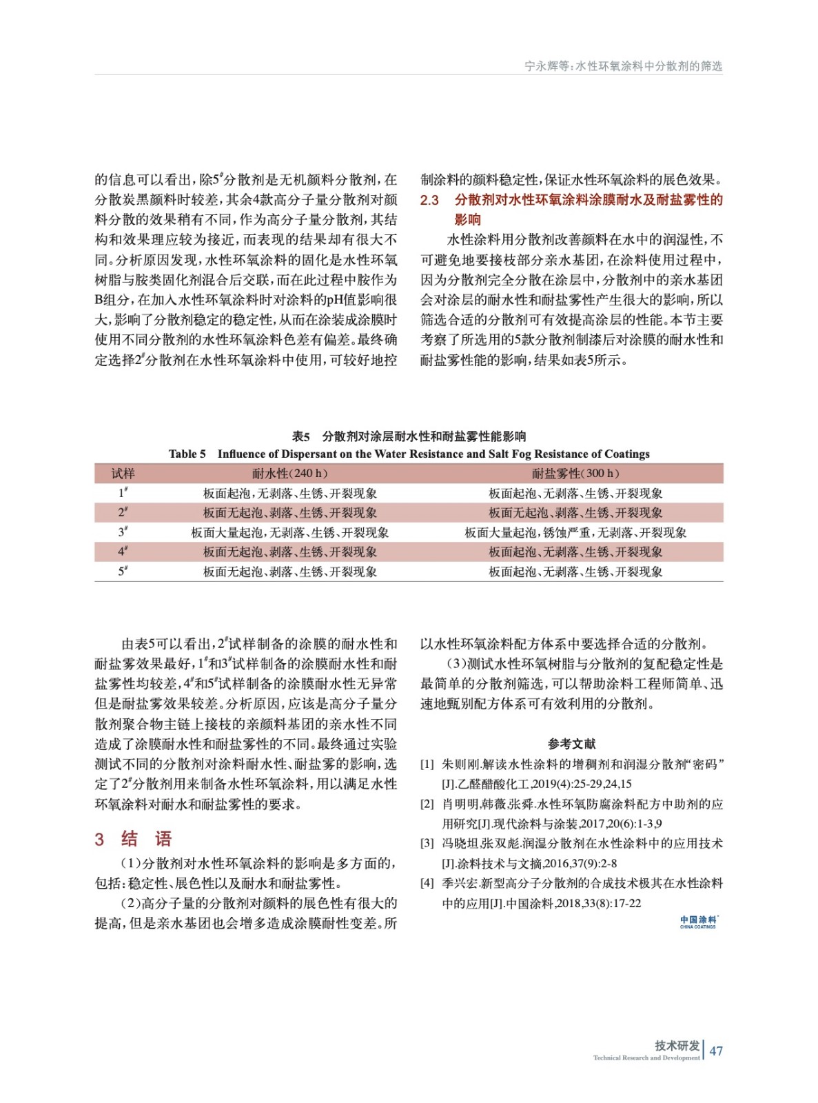 摘要:通過對水性環(huán)氧涂料的研究,深入分析了不同分散劑對水性環(huán)氧涂料的穩(wěn)定性、顏料分散性、防腐性的影響。結(jié)果表明,篩選合適的分散劑有利于水性環(huán)氧涂料的貯存穩(wěn)定性,同時也能最大限度地降低分散劑對涂膜性能的影響;在水性環(huán)氧面漆中,選擇合適的分散劑可使顏料充分展色并防止顏料絮凝,避免浮色、發(fā)花等涂膜弊病,使水性涂料涂裝后顏色均一。