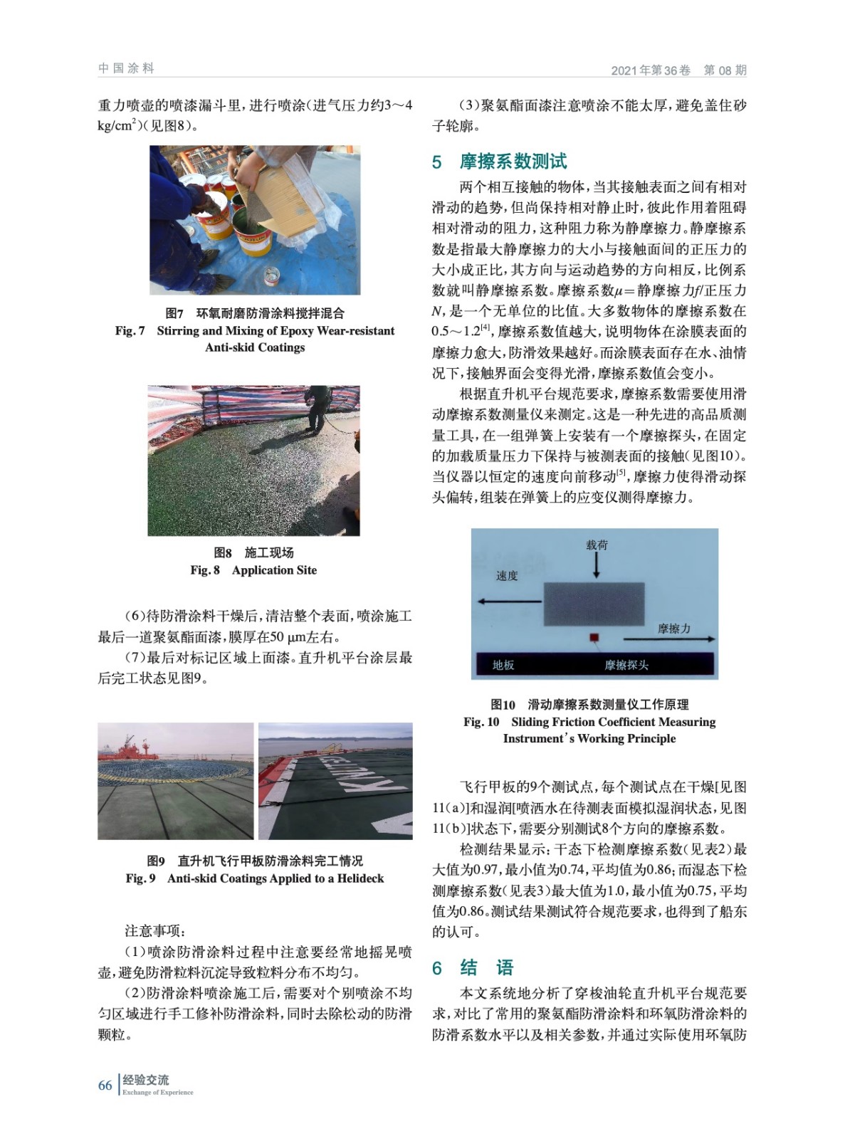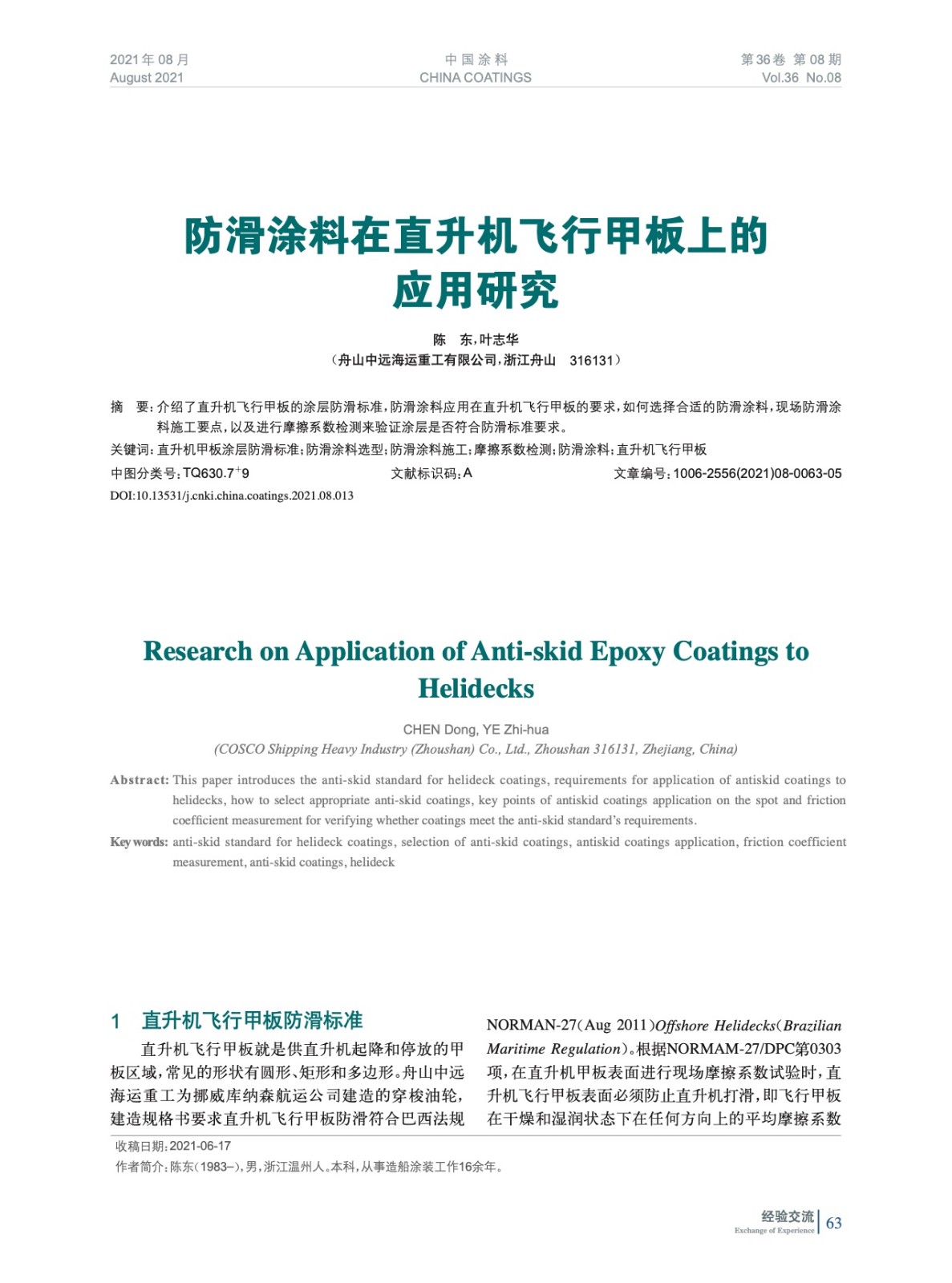 摘要:介紹了直升機飛行甲板的涂層防滑標準,防滑涂料應用在直升機飛行甲板的要求,如何選擇合適的防滑涂料,現(xiàn)場防滑涂料施工要點,以及進行摩擦系數(shù)檢測來驗證涂層是否符合防滑標準要求。