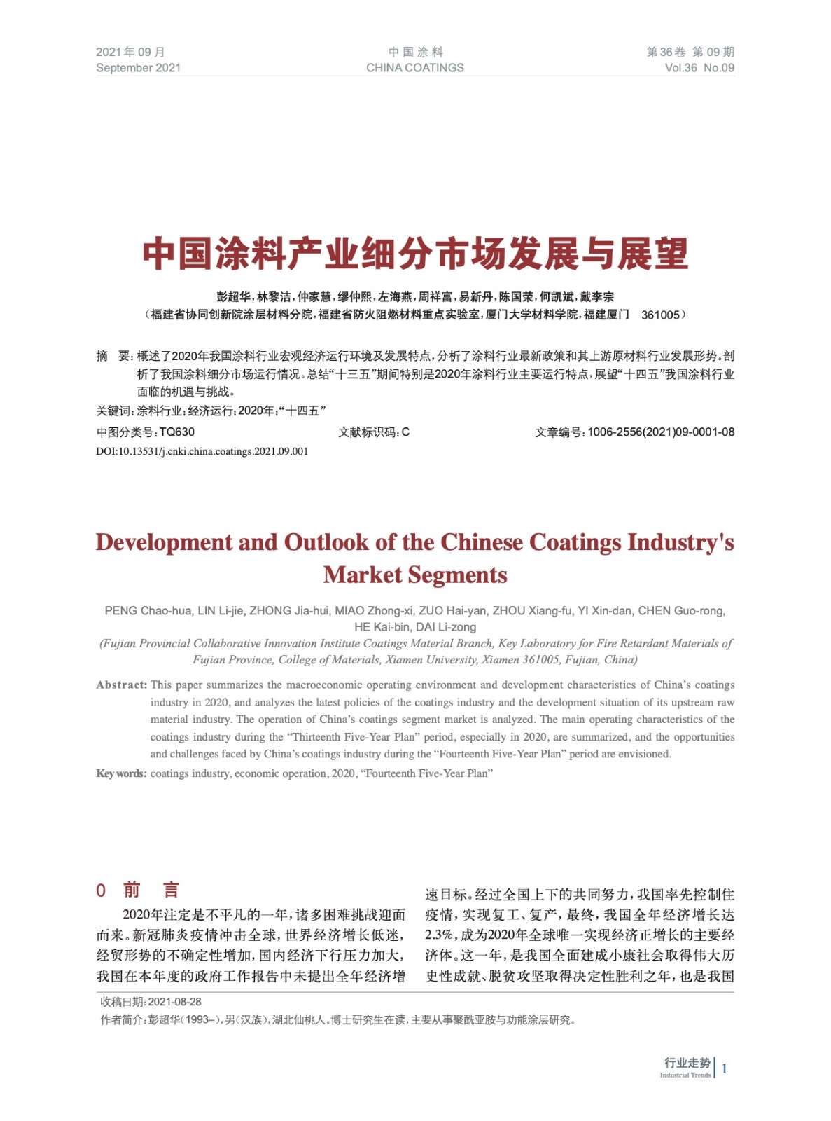 摘要:概述了2020年我國涂料行業宏觀經濟運行環境及發展特點,分析了涂料行業最新政策和其上游原材料行業發展形勢。剖析了我國涂料細分市場運行情況??偨Y“十三五”期間特別是2020年涂料行業主要運行特點,展望“十四五”我國涂料行業面臨的機遇與挑戰。