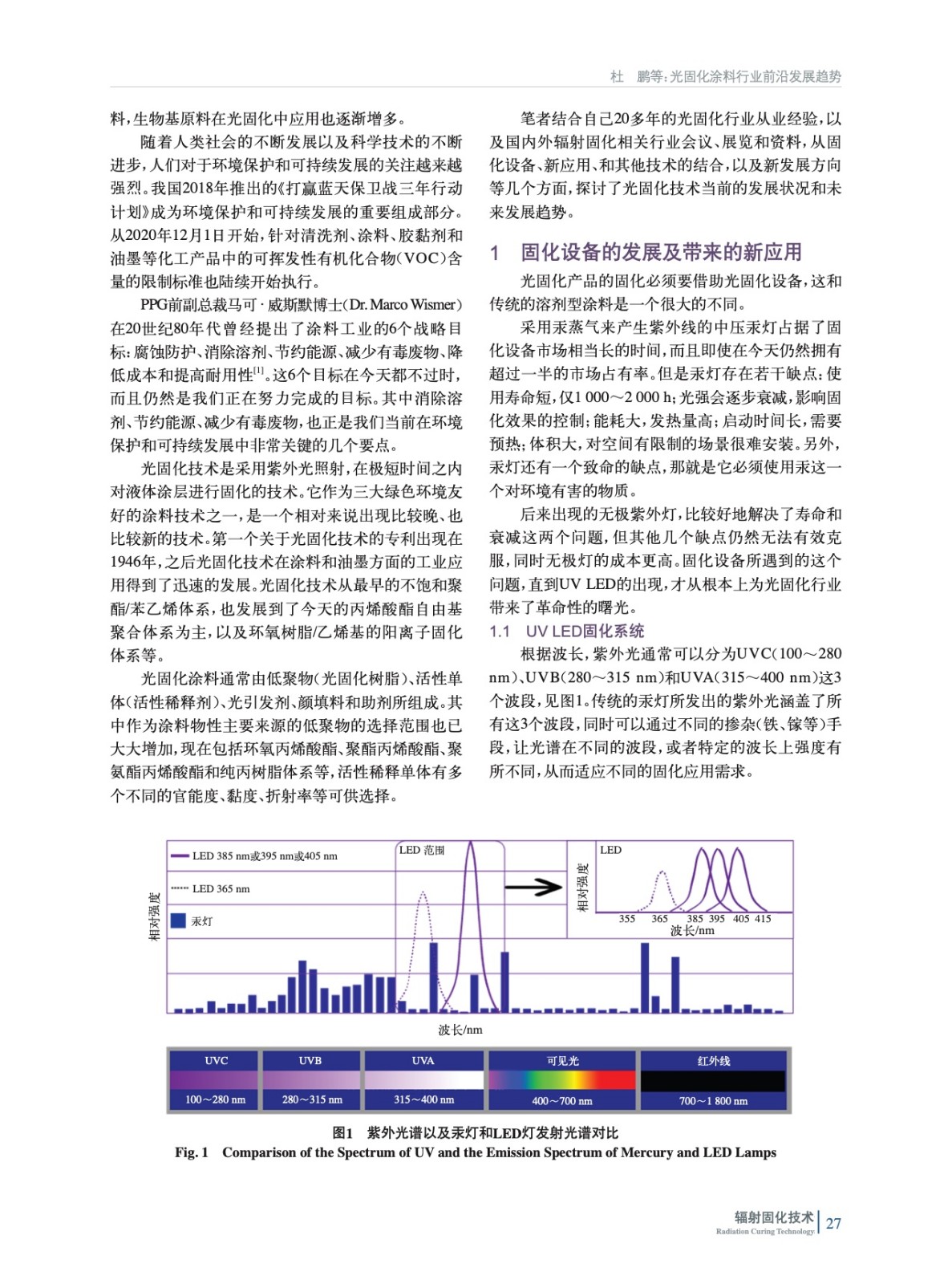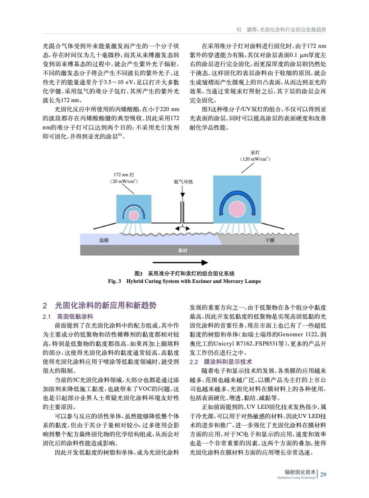 摘要:簡單回顧了光固化技術作為一種綠色環保、高效技術,其在過去的幾十年中的發展歷程。并介紹了固化設備,指出固化設備方面的UV LED、電子束固化、準分子固化拓寬了應用場景,高固低黏、亞光,以及在膜方面的應用等為光固化帶來了新的發展機會,和水性、粉末以及濕氣固化相結合的配合使用,可以對不同的固化技術揚長避短。分析和展望了光固化技術向更多應用場景的拓展以及和其他固化技術的結合,進一步推動光固化技術快速發展。