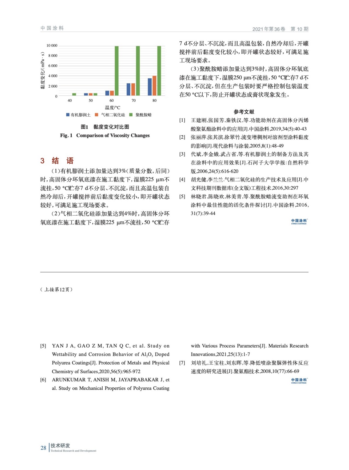摘要:以高固體分環氧底漆為研究對象,考察了制備過程中聚酰胺蠟、氣相二氧化硅以及有機膨潤土3種流變助劑對其開罐狀態的影響。結果表明,在滿足性能前提下:(1)添加有機膨潤土或氣相二氧化硅的高固體分環氧底漆車間生產包裝時,包裝溫度對其開罐攪拌前后黏度變化影響較小,開罐狀態較好;(2)包裝溫度越高,添加聚酰胺蠟的高固體分環氧底漆開罐攪拌前后黏度變化越大,即包裝溫度越高,開罐狀態越差。