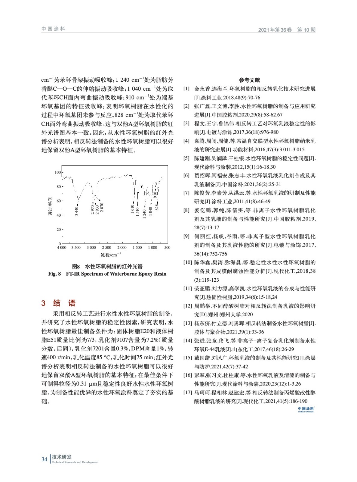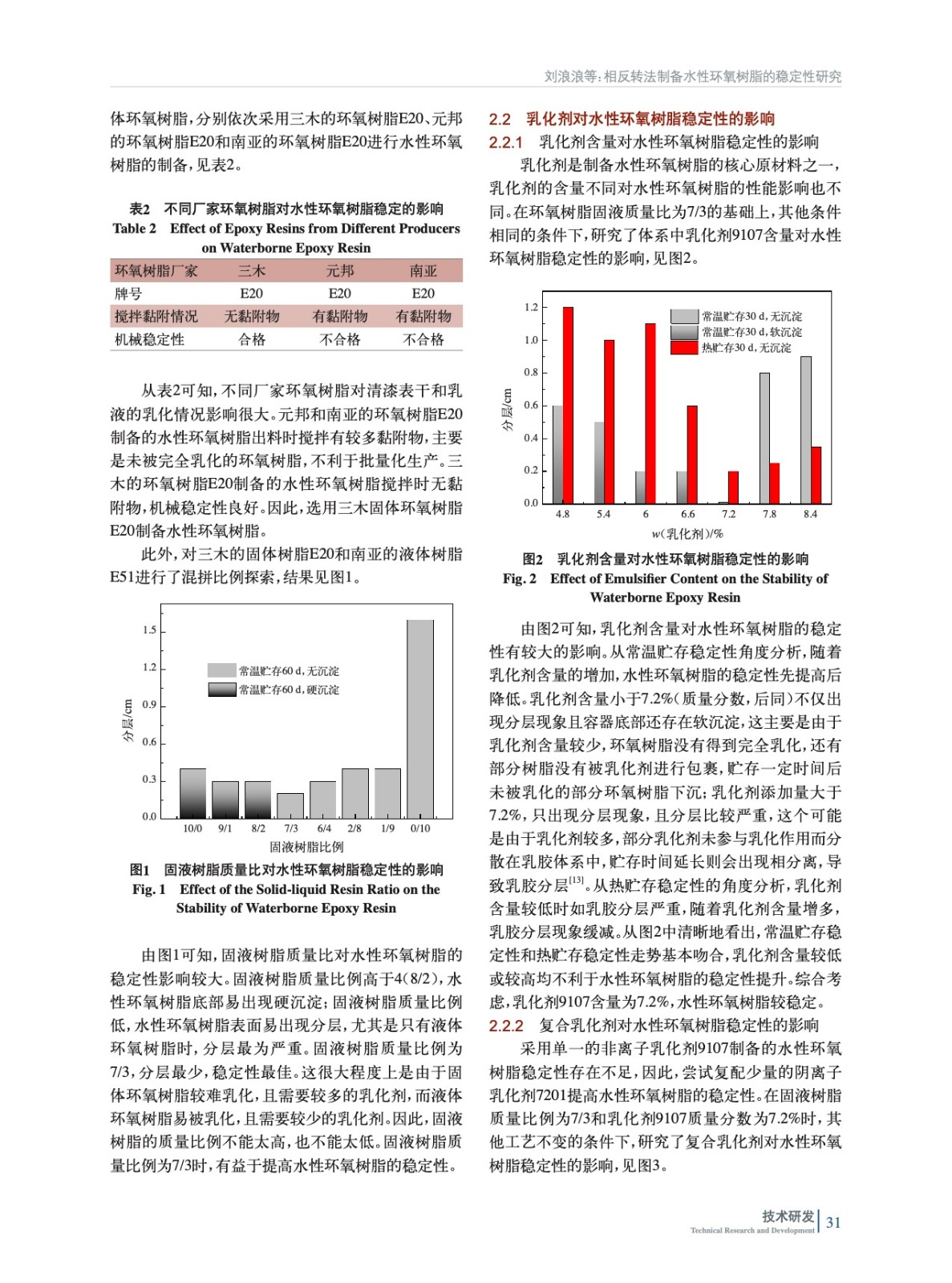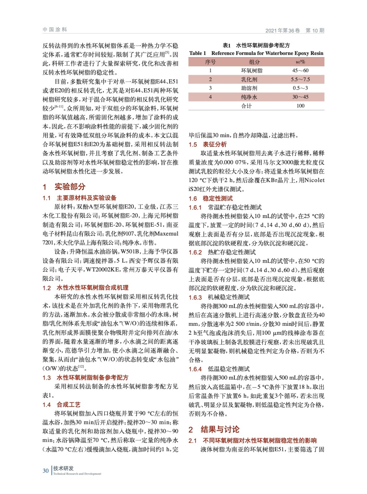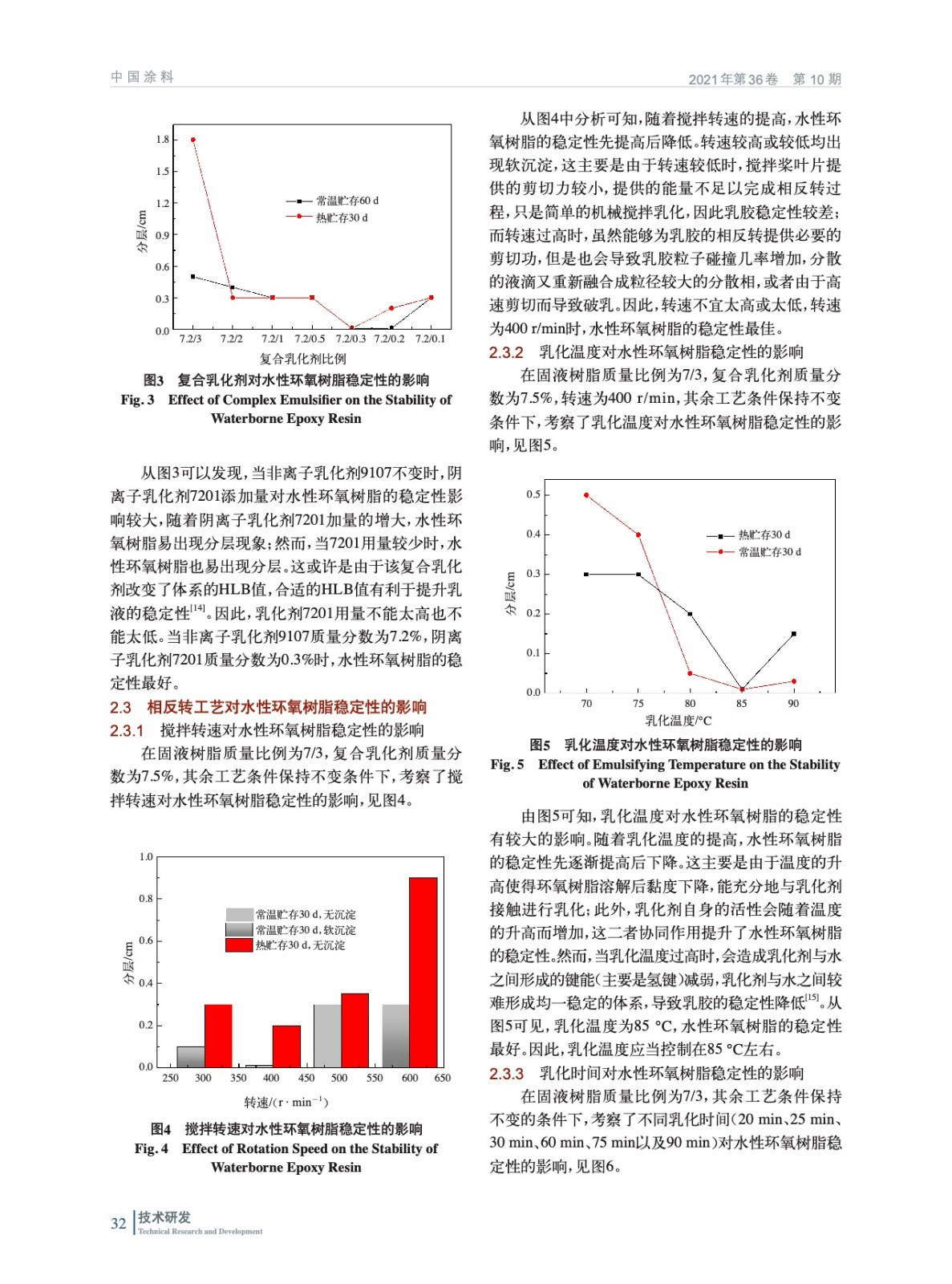 摘要:對相反轉法制備的水性環氧樹脂的穩定性因素進行了探討,研究結果表明:采用固體樹脂E20和液體樹脂E51質量比為7/3,乳化劑9107含量為7.2%,乳化劑7201含量0.3%,二丙二醇甲醚含量1%,轉速400 r/min,乳化溫度85 ℃,乳化時間75 min,在此最佳條件下制備的水性環氧樹脂穩定性良好,平均粒徑為0.31 μm。