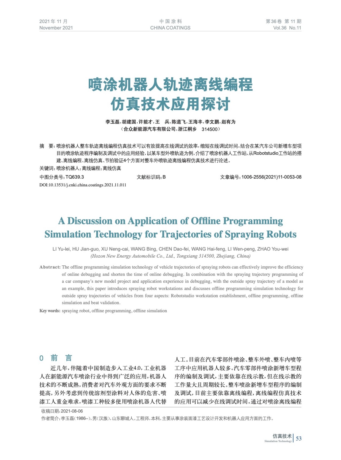 摘要:噴涂機(jī)器人整車軌跡離線編程仿真技術(shù)可以有效提高在線調(diào)試的效率,縮短在線調(diào)試時(shí)間。結(jié)合在某汽車公司新增車型項(xiàng)目的噴涂軌跡程序編制及調(diào)試中的應(yīng)用經(jīng)驗(yàn),以某車型外噴軌跡為例,介紹了噴涂機(jī)器人工作站,從Robotstudio工作站的搭建、離線編程、離線仿真、節(jié)拍驗(yàn)證4個(gè)方面對(duì)整車外噴軌跡離線編程仿真技術(shù)進(jìn)行論述。