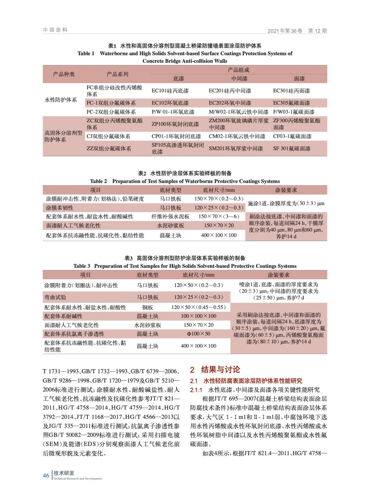 摘要:針對混凝土橋梁防撞墻極易受外界復雜腐蝕環境影響并造成嚴重損傷問題,本研究以“底漆+中間漆+面漆”的復合涂層體系作為設計方案,分別采用3種水性和3種高固體分溶劑型混凝土表面復合防護涂層體系,根據相應標準分別對它們進行了系統性評價研究。