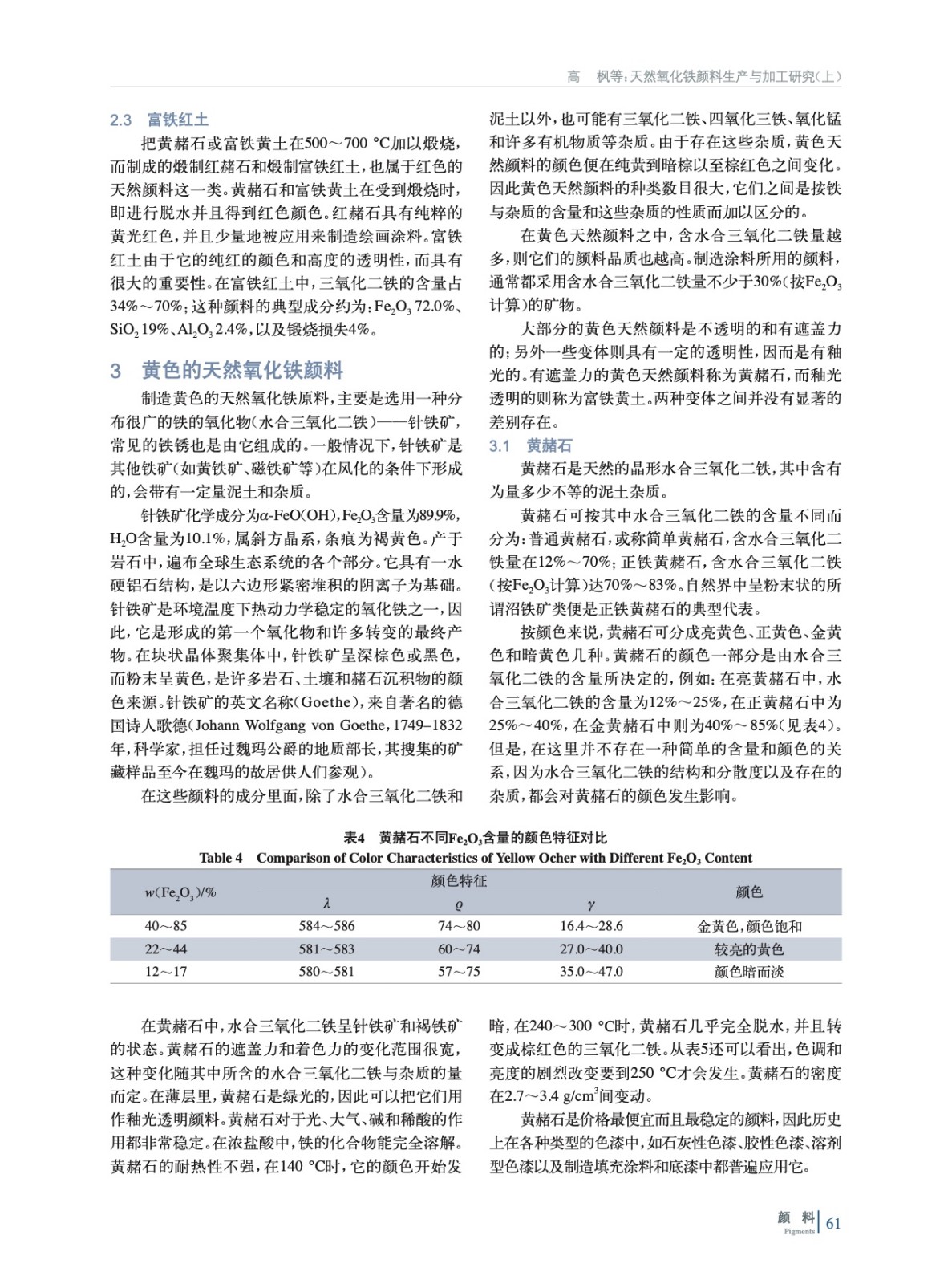 基于天然氧化鐵顏料發現的歷史,就紅色、黃色、棕色、黑色天然氧化鐵顏料以及特殊變體云母氧化鐵的化學特征、產地分布、現代應用進行詳細闡述,并分析比較各自生產工藝與質量標準,以期為相關從業者和研究人員在天然氧化鐵顏料的生產、加工以及使用提供技術依據與科學指導。