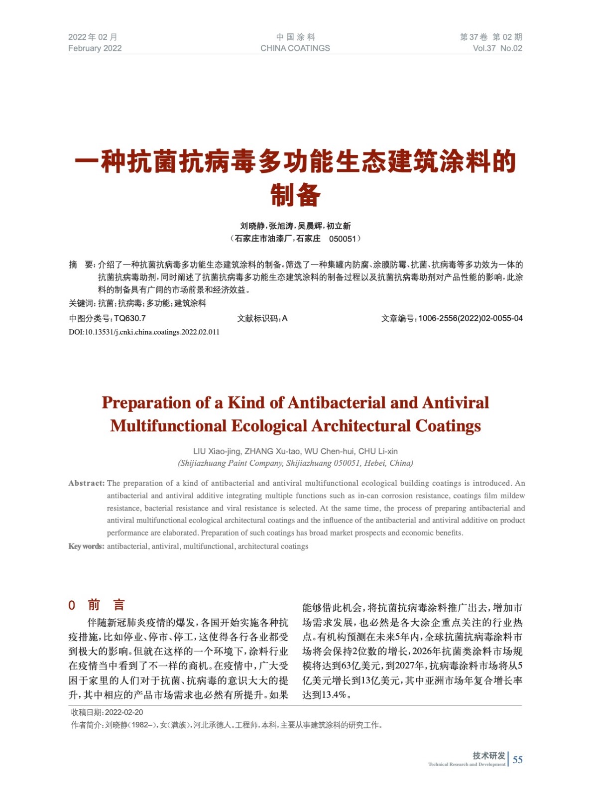 摘要:介紹了一種抗菌抗病毒多功能生態(tài)建筑涂料的制備。篩選了一種集罐內(nèi)防腐、涂膜防霉、抗菌、抗病毒等多功效為一體的抗菌抗病毒助劑,同時(shí)闡述了抗菌抗病毒多功能生態(tài)建筑涂料的制備過(guò)程以及抗菌抗病毒助劑對(duì)產(chǎn)品性能的影響,此涂料的制備具有廣闊的市場(chǎng)前景和經(jīng)濟(jì)效益。