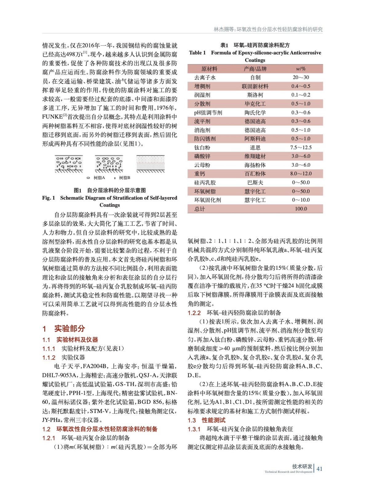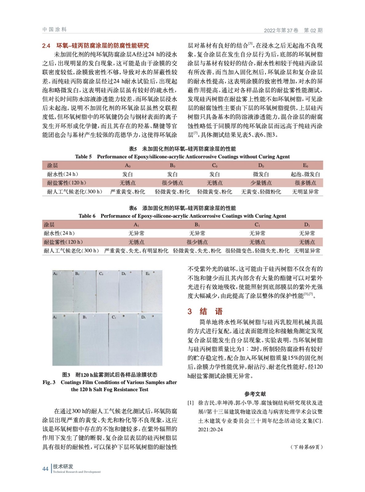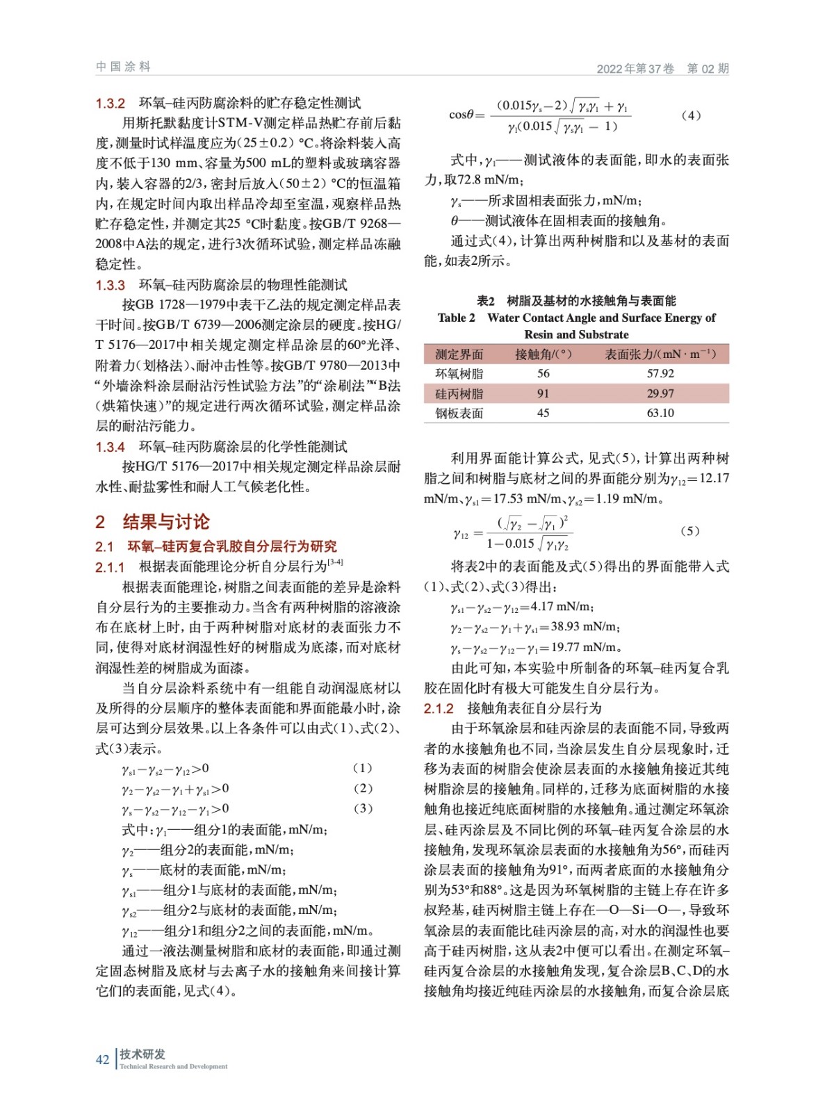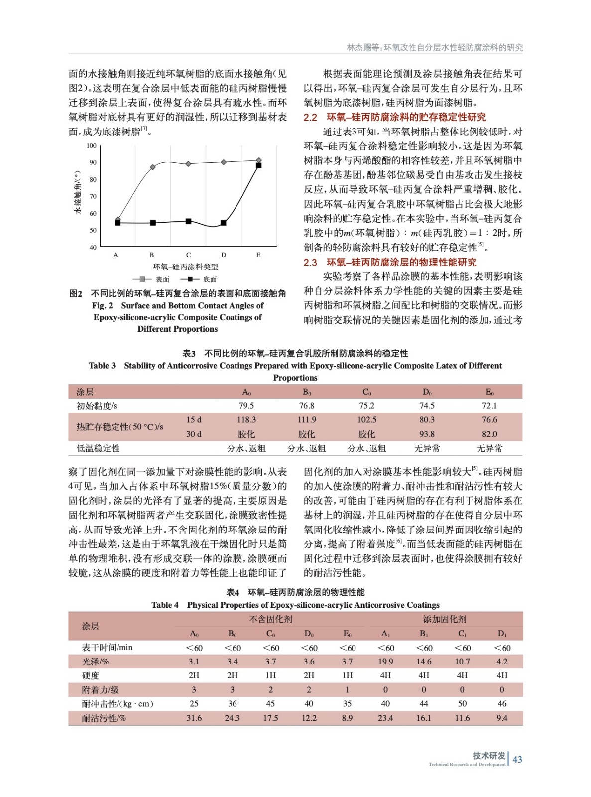 摘要:通過機械共混的方式將水性環氧樹脂與硅丙乳膠進行復配,并添加防腐顏料、填料及各種助劑制備出一種自分層水性輕防腐涂料。進行表征發現純環氧涂層的水接觸角為56°、純硅丙涂層的水接觸角為91°,而環氧樹脂與硅丙乳膠經過2∶1、1∶1、1∶2復配所得的涂層水接觸角分別為87°、89°、90°,并預測了復合涂層的自分層現象。結果表明,復合涂層在經過120 h耐鹽霧測試后涂膜無異常,力學性能優異。