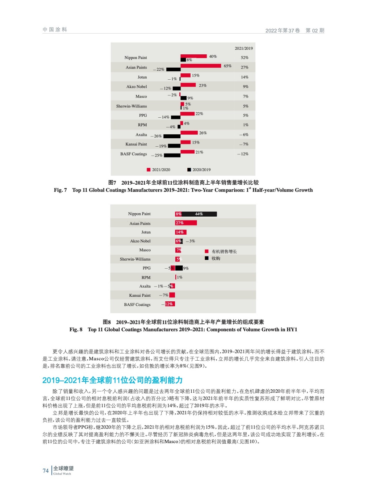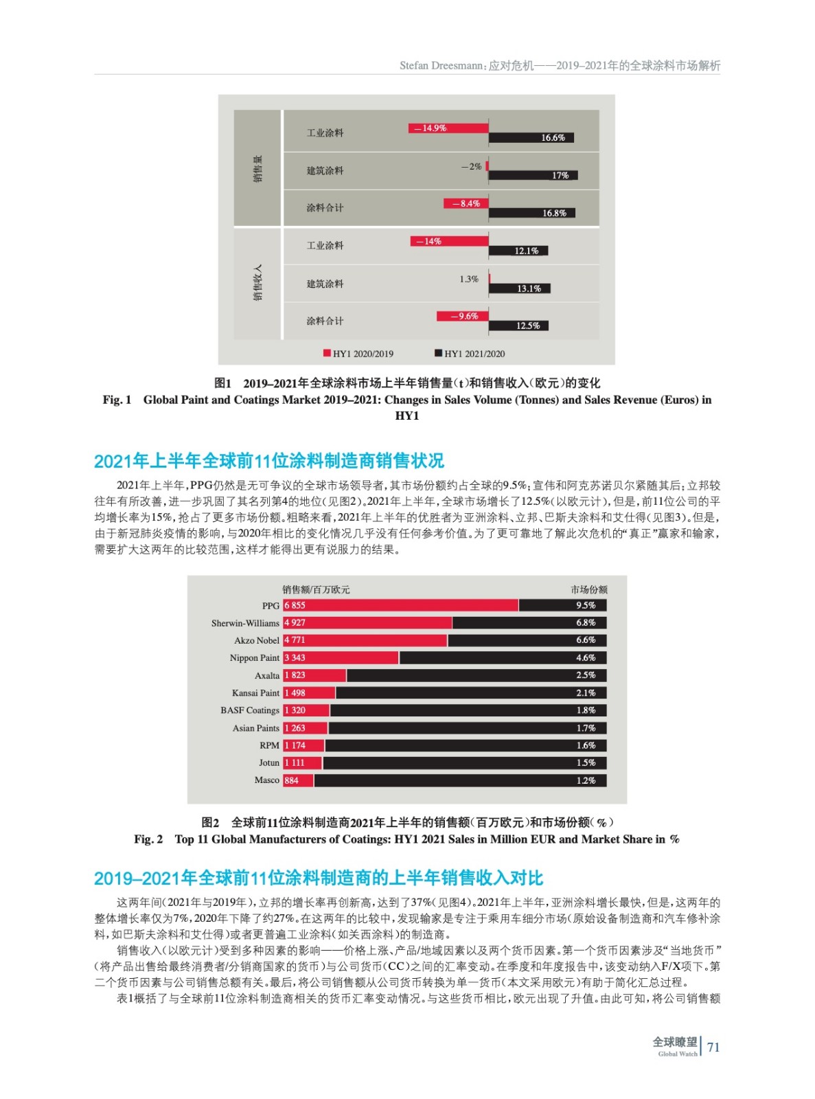 摘要:編者按:過去兩年,在涂料行業(yè)的前11位涂料制造商中,哪些公司能夠最好地應(yīng)對新冠肺炎疫情危機(jī)?在涂料行業(yè)跨國公司的2021年上半年財務(wù)報告中,銷售增長令人眼花繚亂。那么,“一切都好起來了”嗎?本文將進(jìn)一步深入研究這些公司的銷售額、銷售量,分析“有機(jī)銷售增長”和“收購”,以及“建筑涂料”和“工業(yè)涂料”細(xì)分市場的相對變化。最后,將快速了解這些公司的盈利能力。