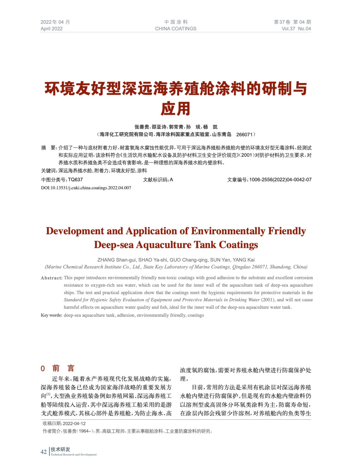 環(huán)境友好型深遠(yuǎn)海養(yǎng)殖艙涂料的研制與應(yīng)用