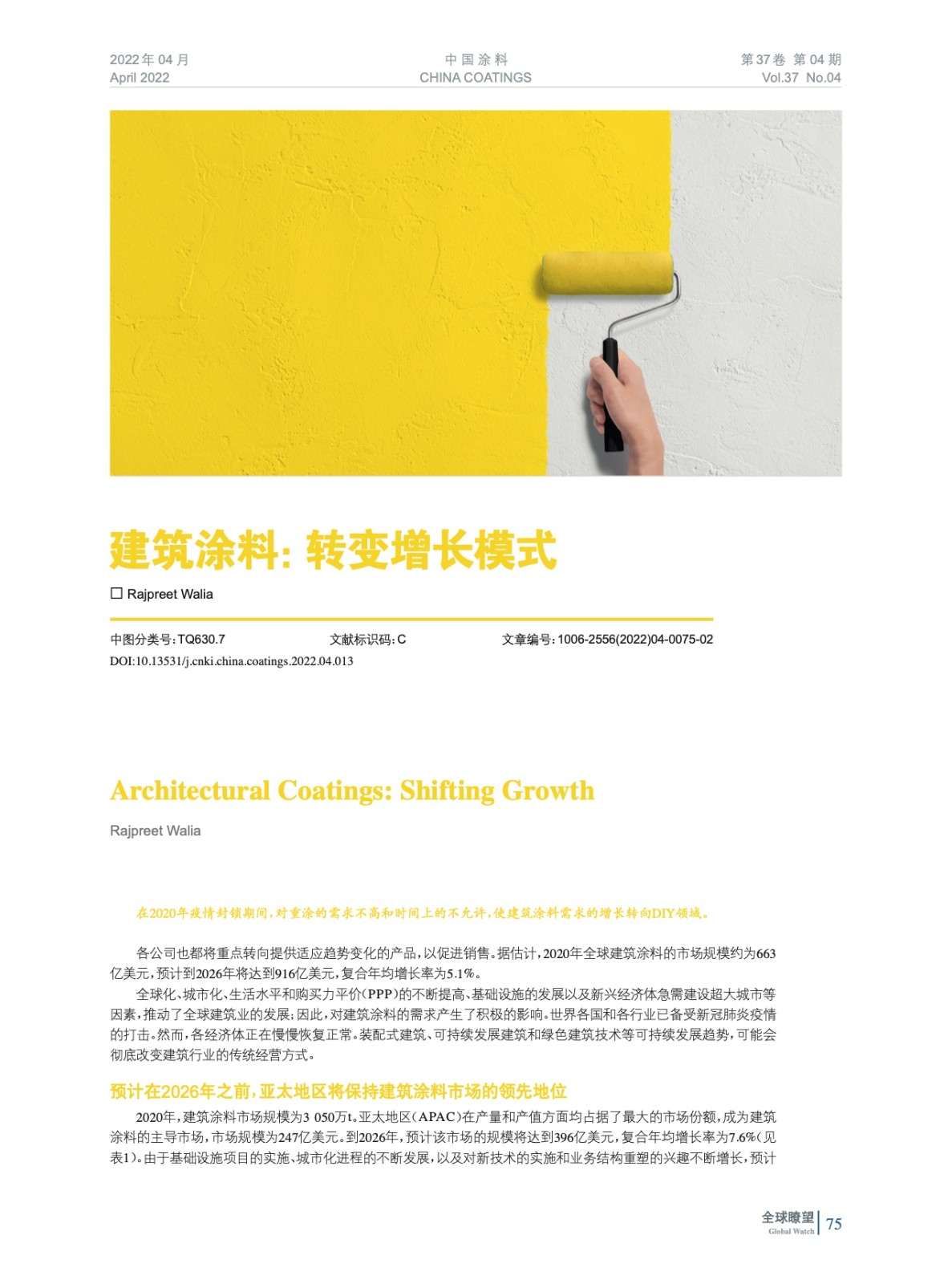 摘要:編者按:在2020年疫情封鎖期間,對重涂的需求不高和時間上的不允許,使建筑涂料需求的增長轉(zhuǎn)向DIY領(lǐng)域。各公司也都將重點轉(zhuǎn)向提供適應趨勢變化的產(chǎn)品,以促進銷售。據(jù)估計,2020年全球建筑涂料的市場規(guī)模約為663億美元,預計到2026年將達到916億美元,復合年均增長率為5.1%。