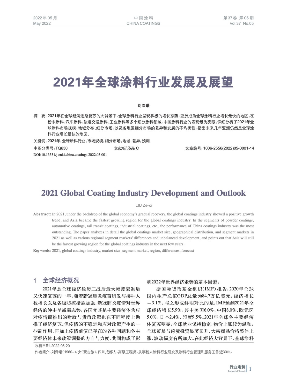 摘要:2021年在全球經(jīng)濟逐漸復蘇的大背景下,全球涂料行業(yè)呈現(xiàn)積極的增長態(tài)勢,亞洲成為全球涂料行業(yè)增長最快的地區(qū)。在粉末涂料、汽車涂料、軌道交通涂料、工業(yè)涂料等多個細分涂料領域,中國涂料行業(yè)的表現(xiàn)最為亮眼。詳細分析了2021年全球涂料市場規(guī)模、地域分布、細分市場,以及各地區(qū)細分市場的差異和發(fā)展的不均衡性,指出未來幾年亞洲仍然是全球涂料行業(yè)增長最快的地區(qū)。