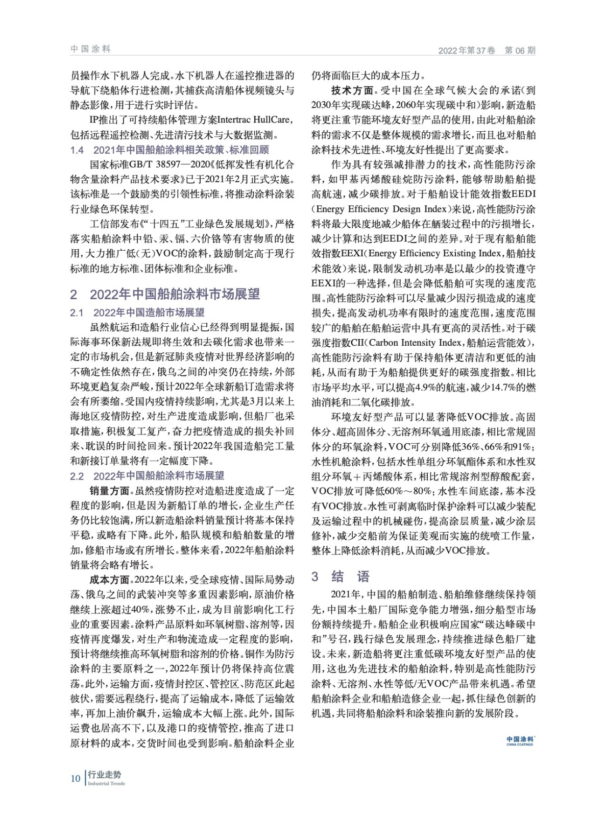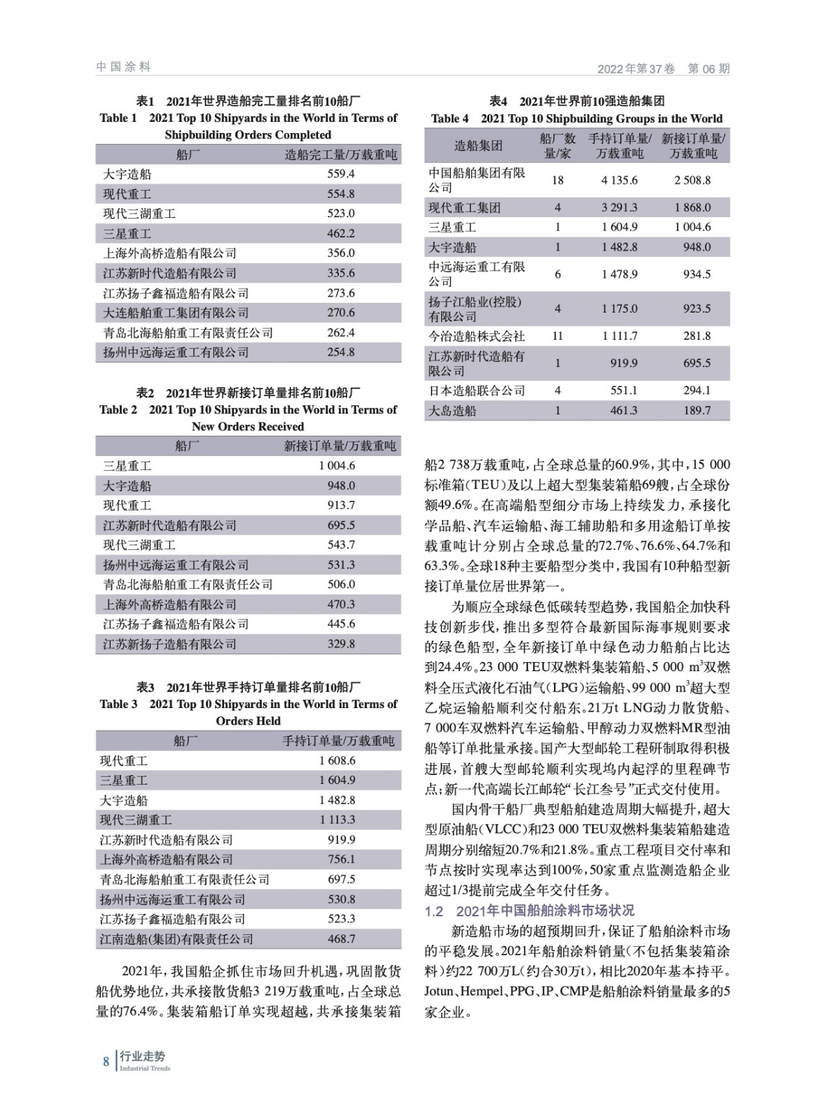 綜述了2021年中國造船市場及船舶涂料市場狀況,回顧梳理了2021年中國船舶涂料技術進展及相關政策和標準,并對2022年中國造船及船舶涂料市場進行了展望。