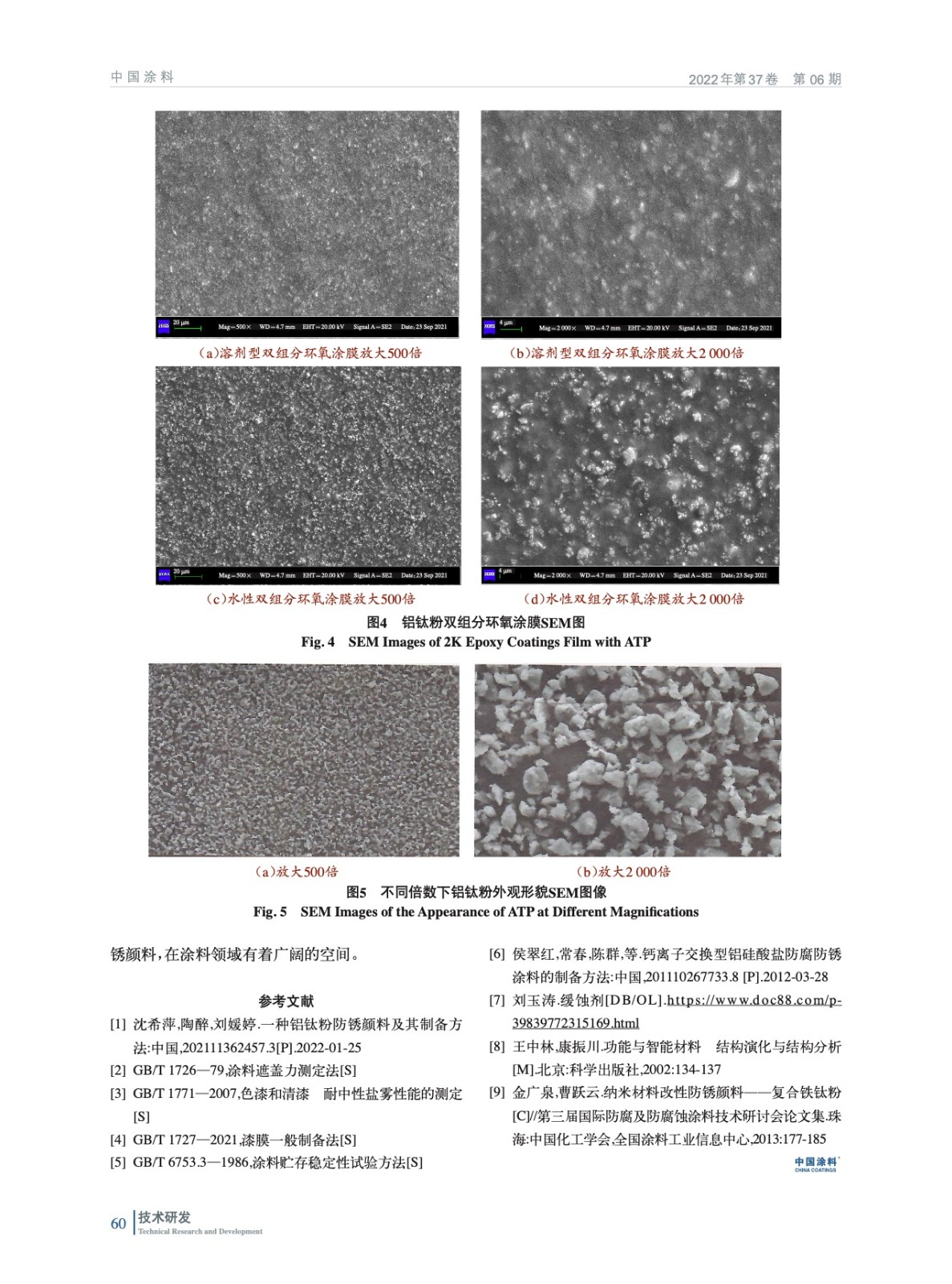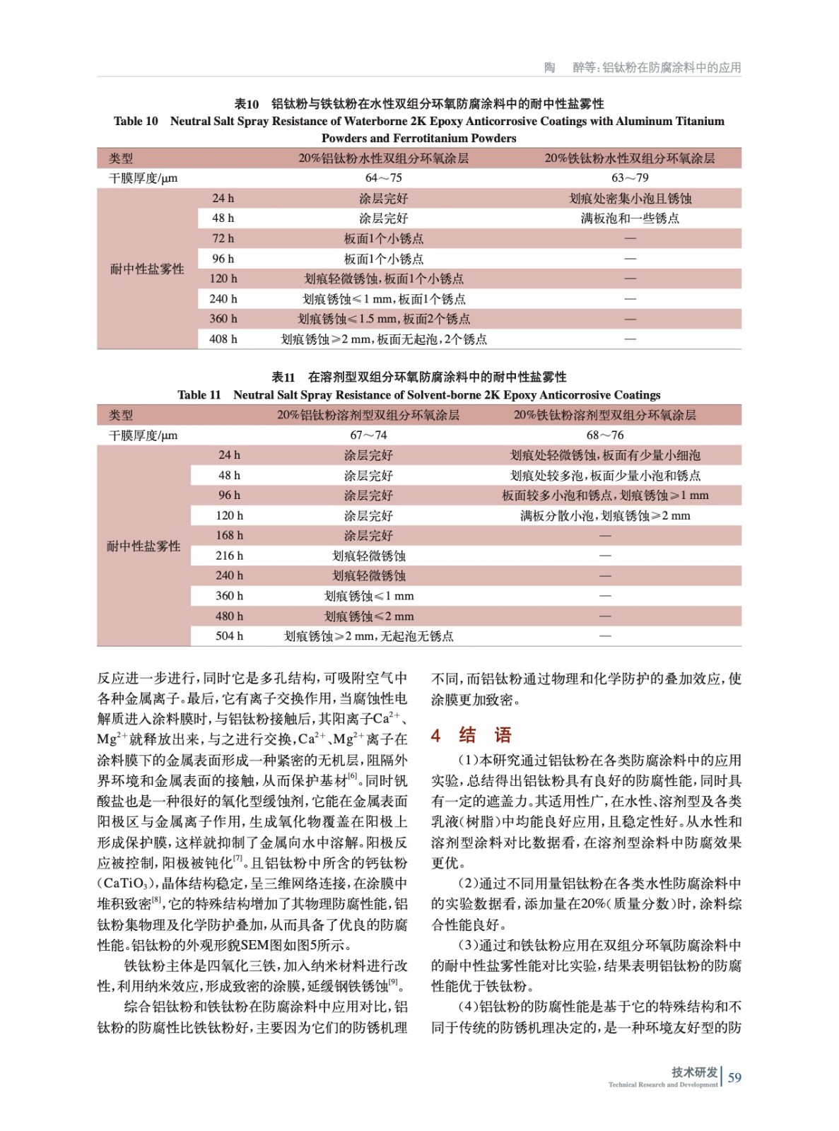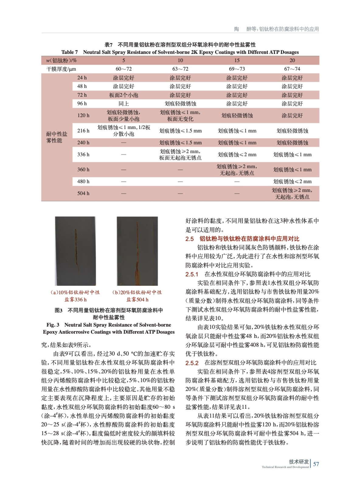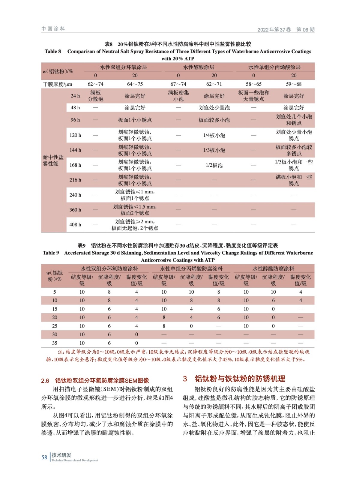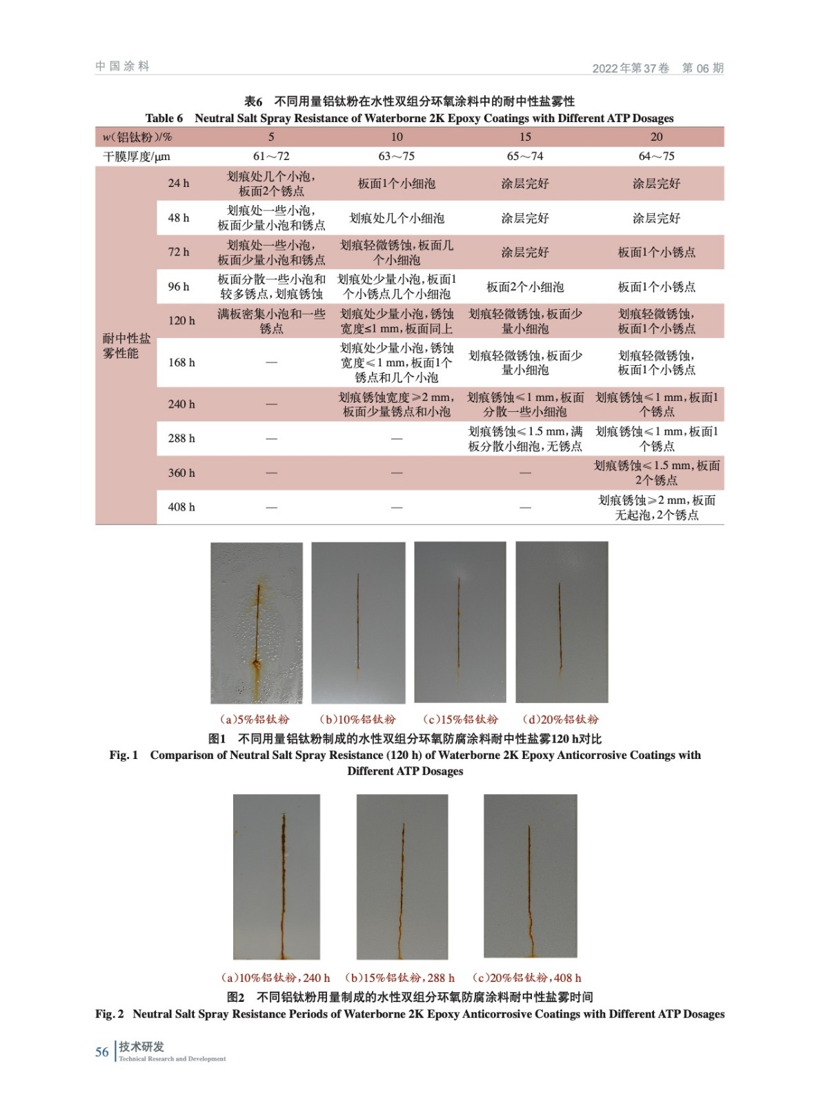 摘要:通過對鋁鈦粉在各類防腐涂料中的應(yīng)用實驗,結(jié)果表明鋁鈦粉具有良好的防腐性能,其用量在20%時,涂料綜合性能良好,水性雙組分環(huán)氧防腐涂料可耐中性鹽霧408 h,水性醇酸防腐涂料可耐中性鹽霧168 h,水性單組分丙烯酸防腐涂料中達(dá)216 h,溶劑型雙組分環(huán)氧防腐涂料中達(dá)500 h。且通過鋁鈦粉和鐵鈦粉的雙組分環(huán)氧防腐涂料耐中性鹽霧性能對比實驗,結(jié)果表明鋁鈦粉的防腐性更優(yōu)。