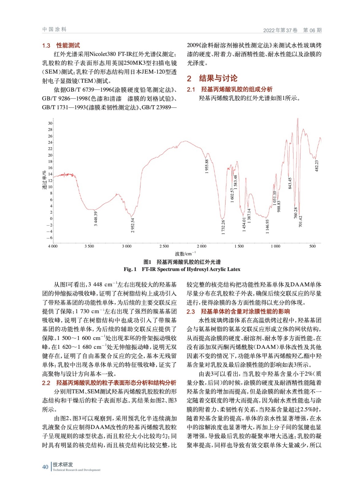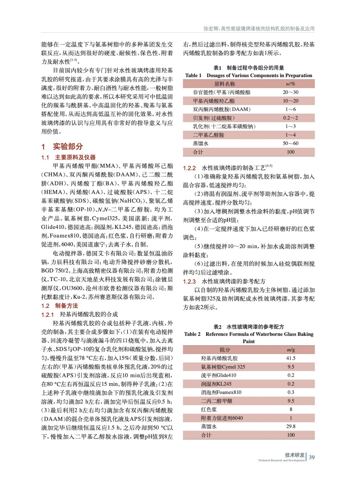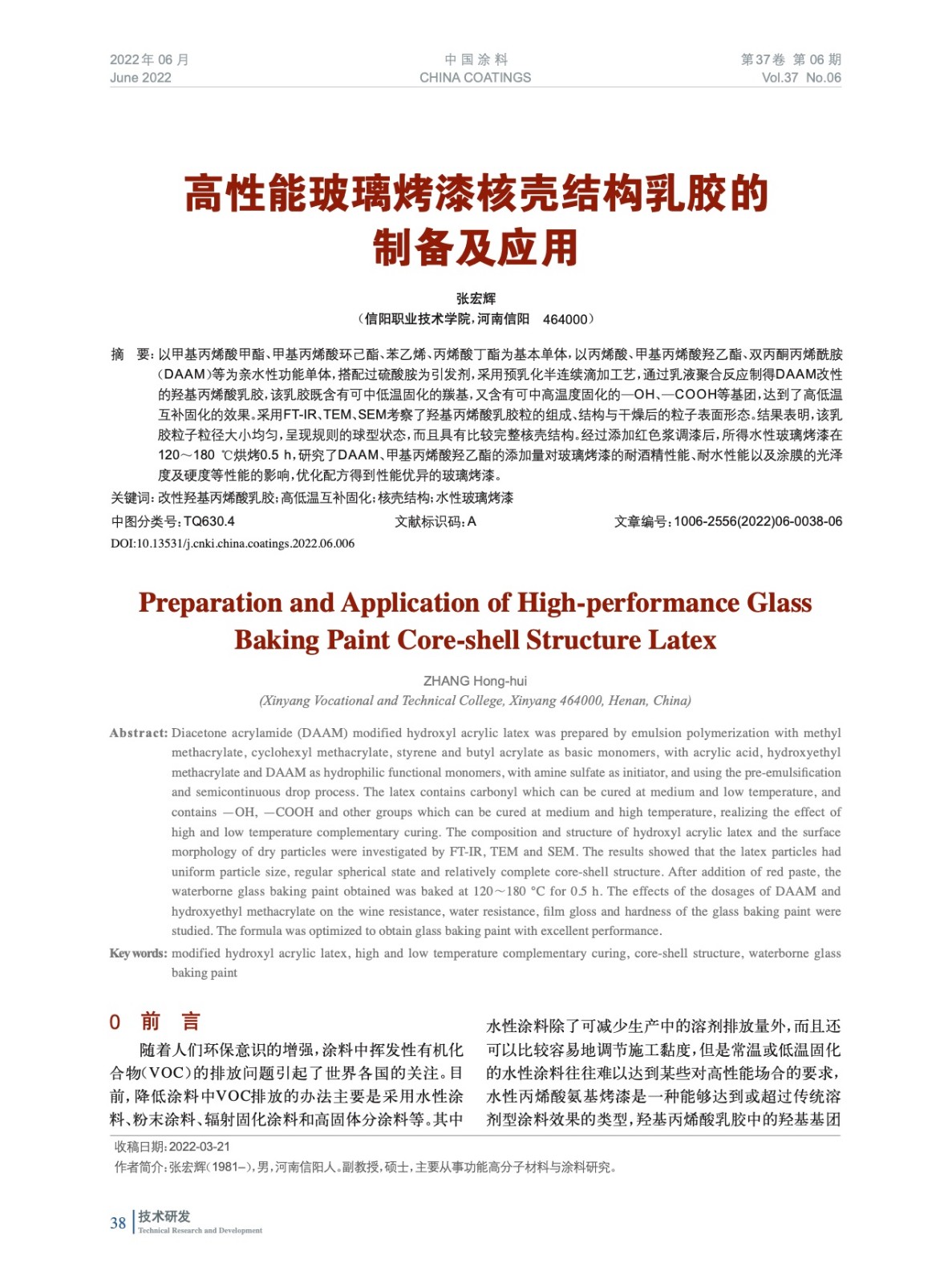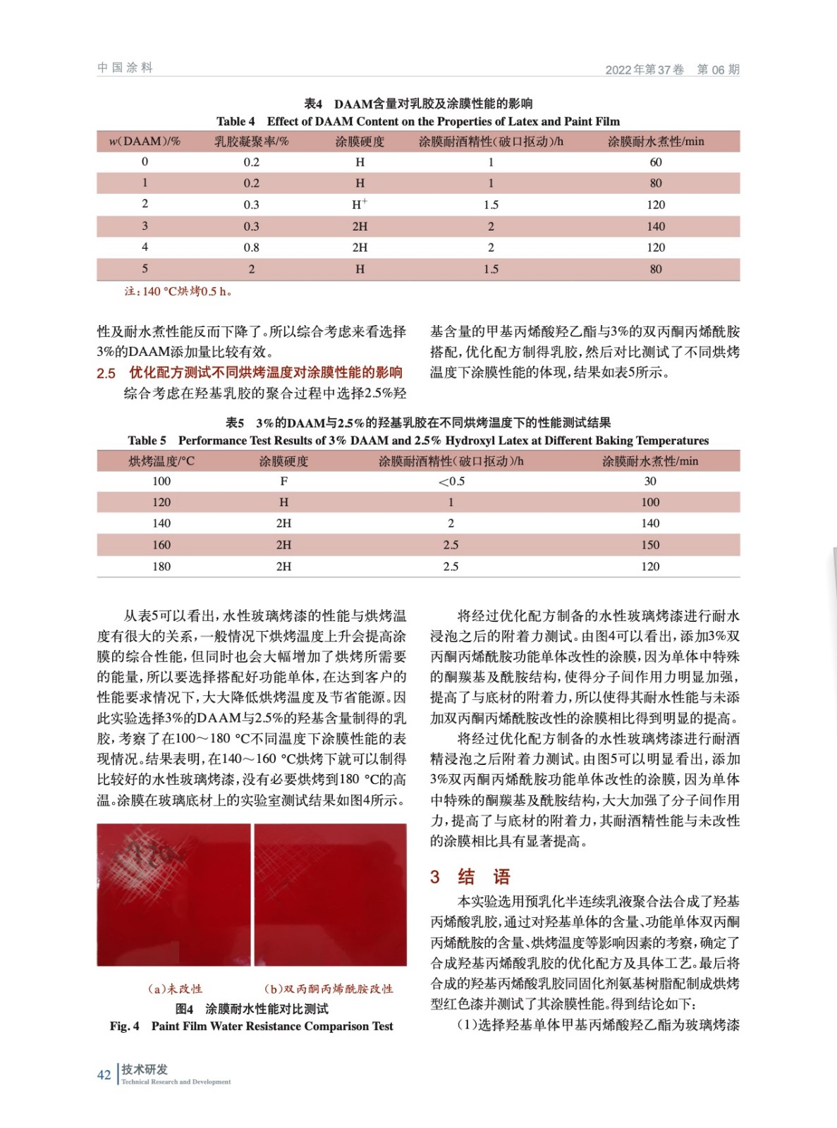 摘要:以甲基丙烯酸甲酯、甲基丙烯酸環己酯、苯乙烯、丙烯酸丁酯為基本單體,以丙烯酸、甲基丙烯酸羥乙酯、雙丙酮丙烯酰胺等為親水性功能單體,搭配過硫酸胺為引發劑,采用預乳化半連續滴加工藝,通過乳液聚合反應制得DAAM改性的羥基丙烯酸乳膠。該乳膠粒子粒徑大小均勻,呈現規則的球型狀態。經過添加紅色漿調漆后,所得水性玻璃烤漆在120~180 ℃烘烤0.5 h,并優化配方得到性能優異的玻璃烤漆。