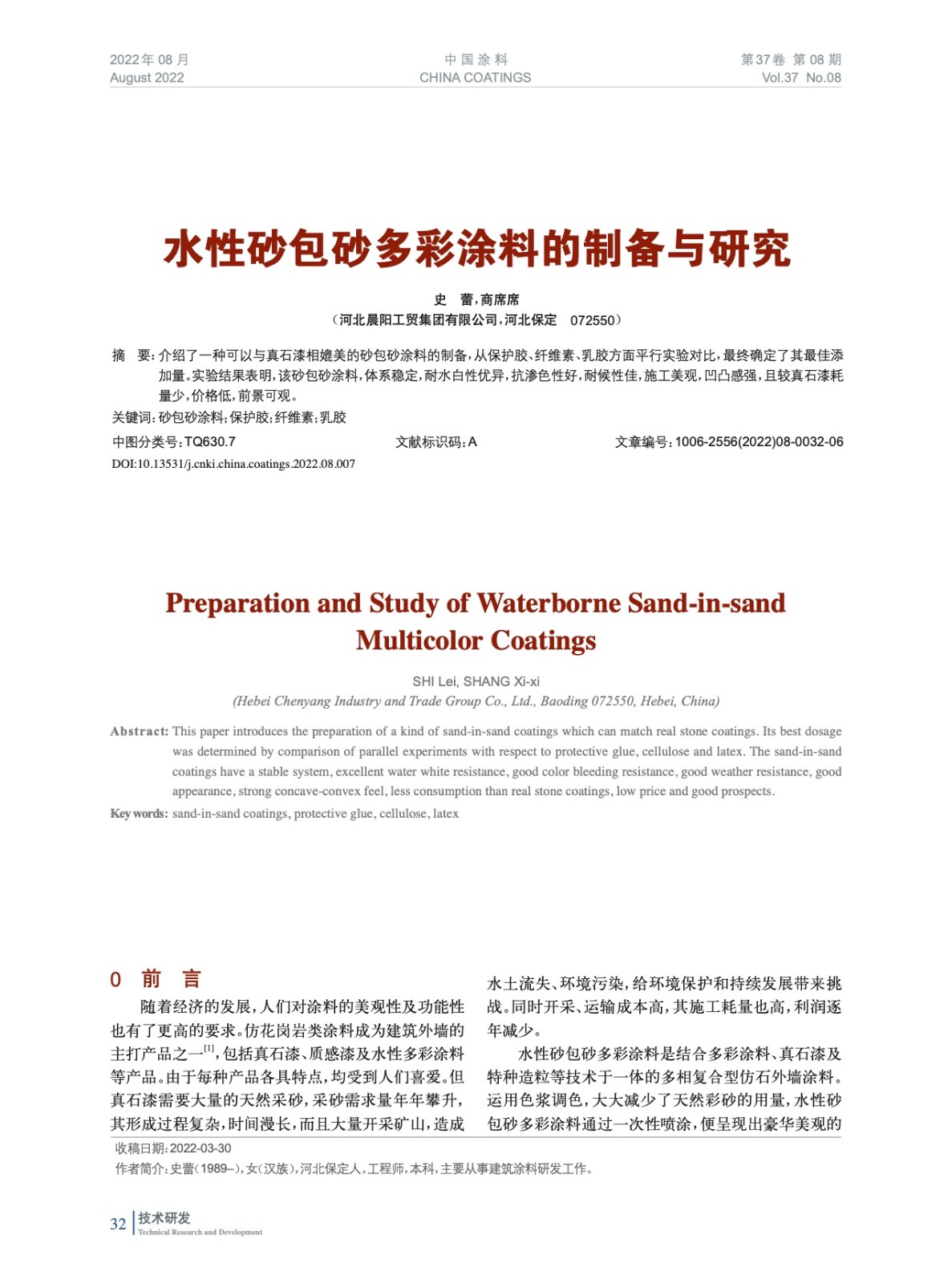 介紹了一種可以與真石漆相媲美的砂包砂涂料的制備,從保護膠、纖維素、乳膠方面平行實驗對比,最終確定了其最佳添加量。實驗結果表明,該砂包砂涂料,體系穩定,耐水白性優異,抗滲色性好,耐候性佳,施工美觀,凹凸感強,且較真石漆耗量少,價格低,前景可觀。