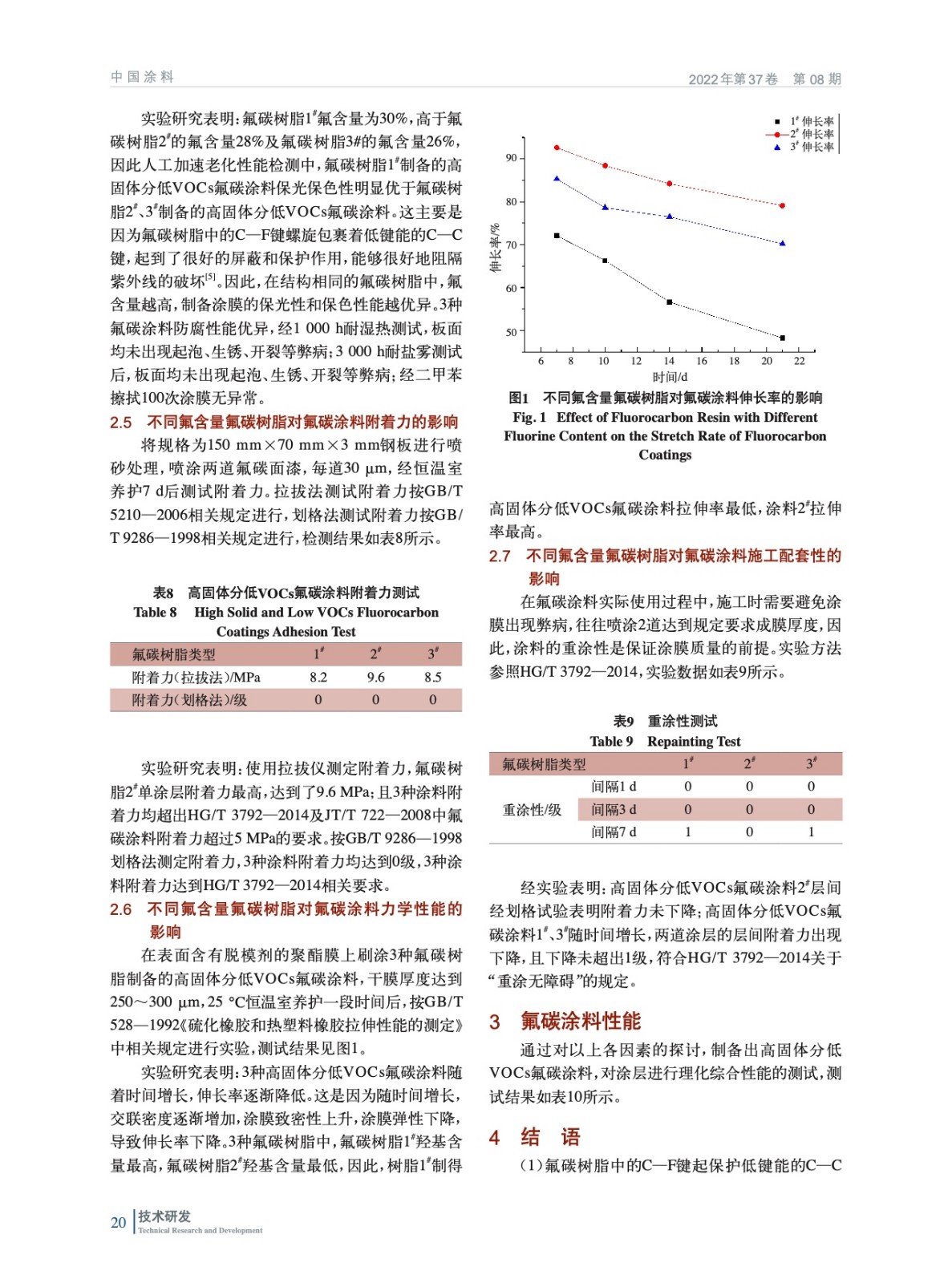摘要:采用高氟含量氟碳樹脂,用于制備常溫固化高固體分低VOCs氟碳涂料。研究表明:C—F鍵的螺旋包裹作用能有效提高涂膜的屏蔽和保護作用,氟含量的提高能有效增加涂膜的耐化學品性及耐人工老化性;氟碳樹脂的低極性使涂膜表面張力低,提高氟含量可以提升涂膜的耐沾污性;高氟含量樹脂溶劑的加入量大,造成涂料體積固體分減低,VOCs增加;氟碳涂料制備涂膜,隨時間增長涂膜交聯(lián)密度提升,拉伸率降低。