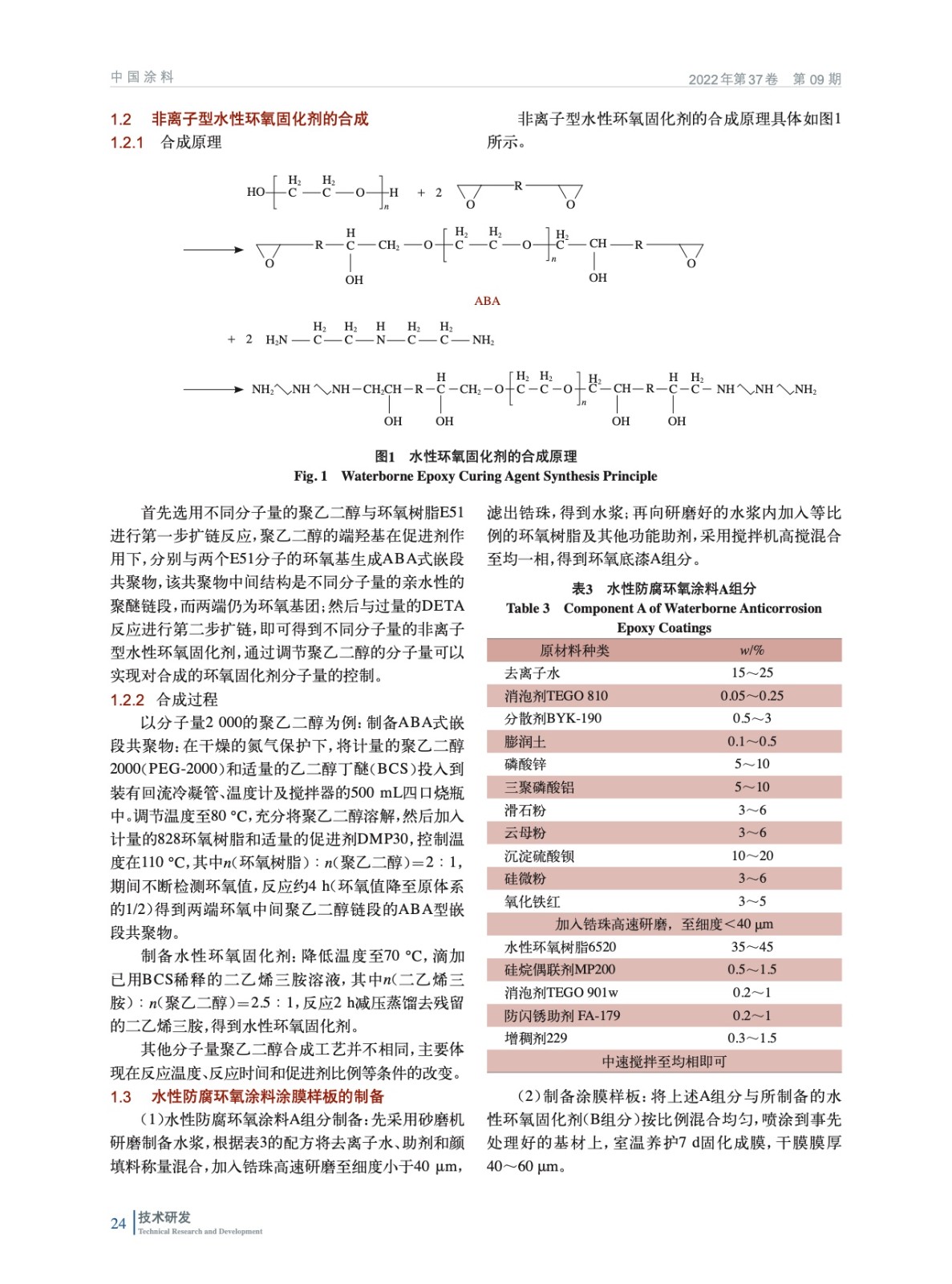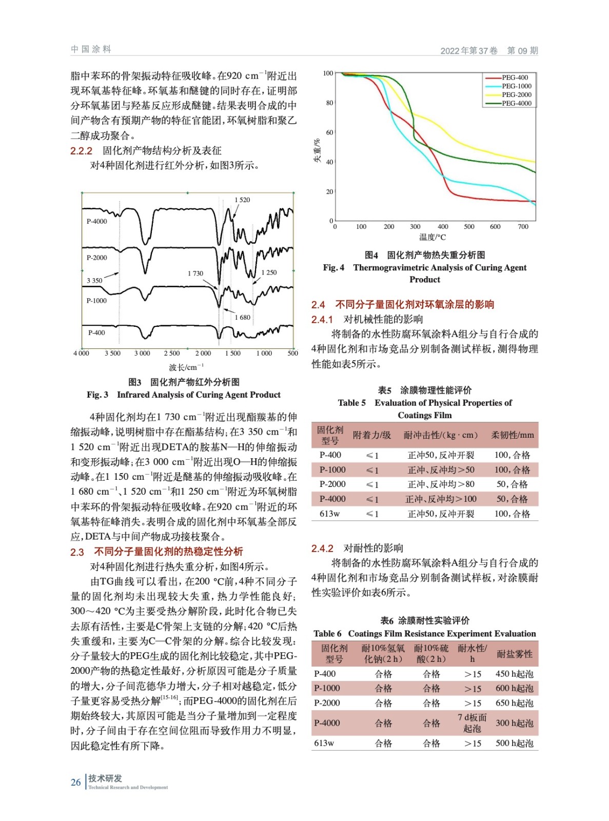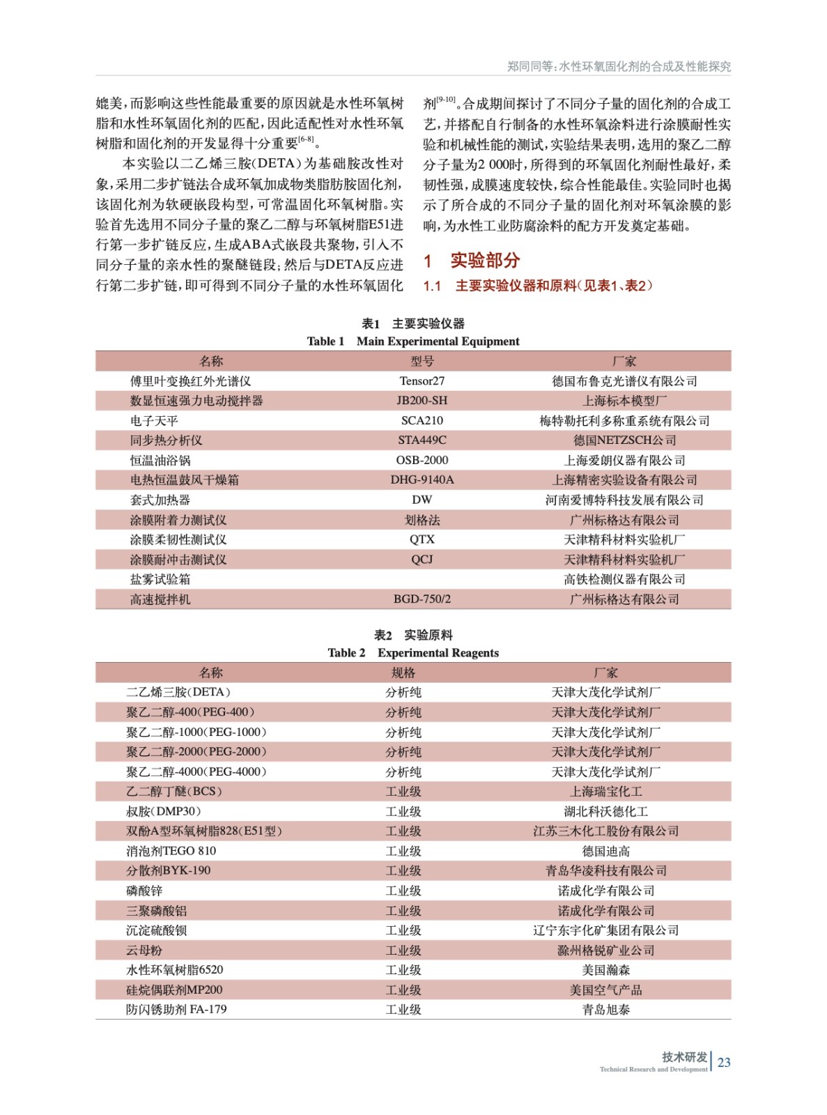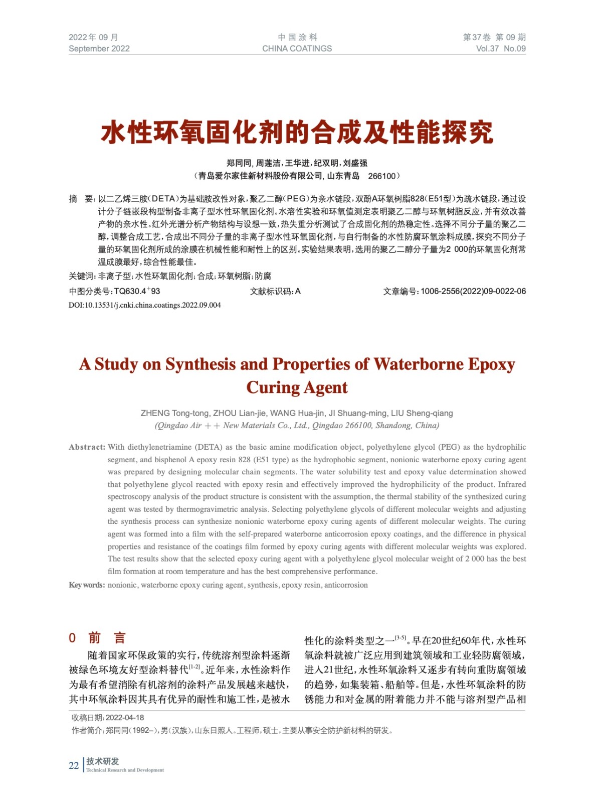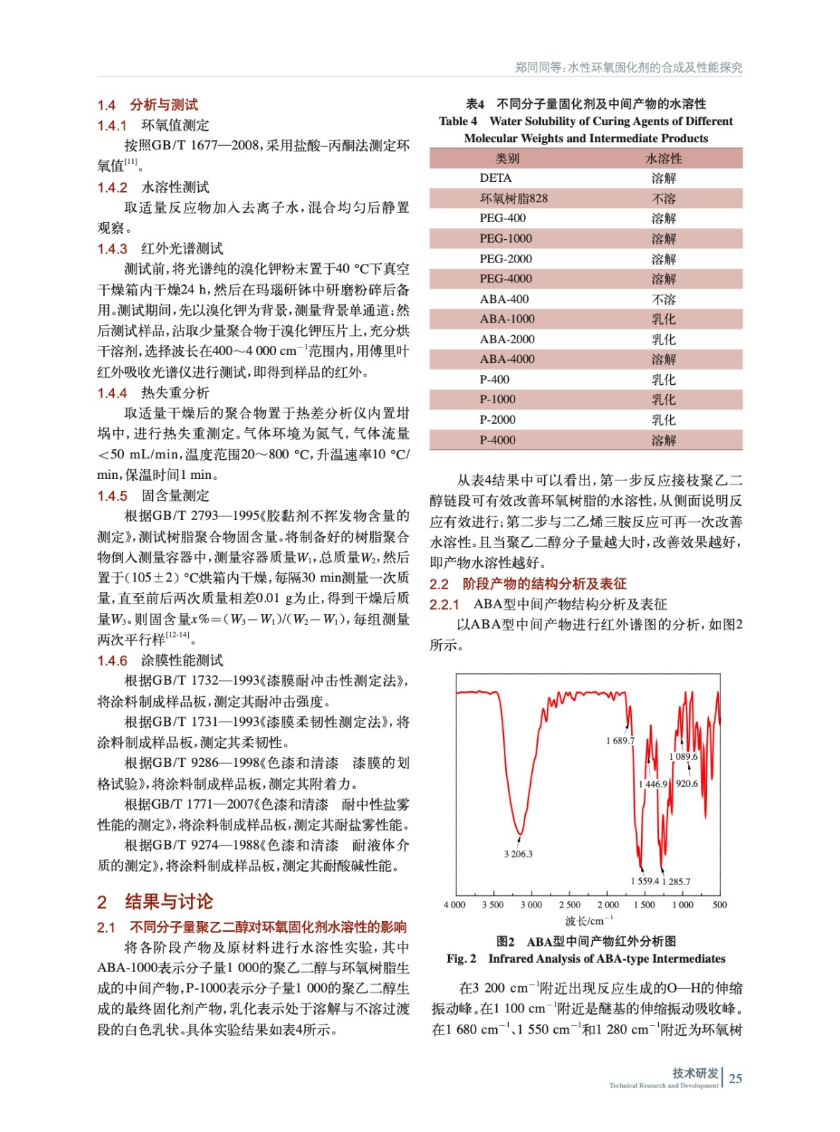 摘要:以二乙烯三胺為基礎胺改性對象,聚乙二醇為親水鏈段,雙酚A環氧樹脂828為疏水鏈段,通過設計分子鏈嵌段構型制備非離子型水性環氧固化劑。水溶性實驗和環氧值測定表明聚乙二醇與環氧樹脂反應,并有效改善產物的親水性。紅外光譜分析產物結構與設想一致,熱失重分析測試了合成固化劑的熱穩定性。實驗結果表明,選用的聚乙二醇分子量為2 000的環氧固化劑常溫成膜最好,綜合性能最佳。