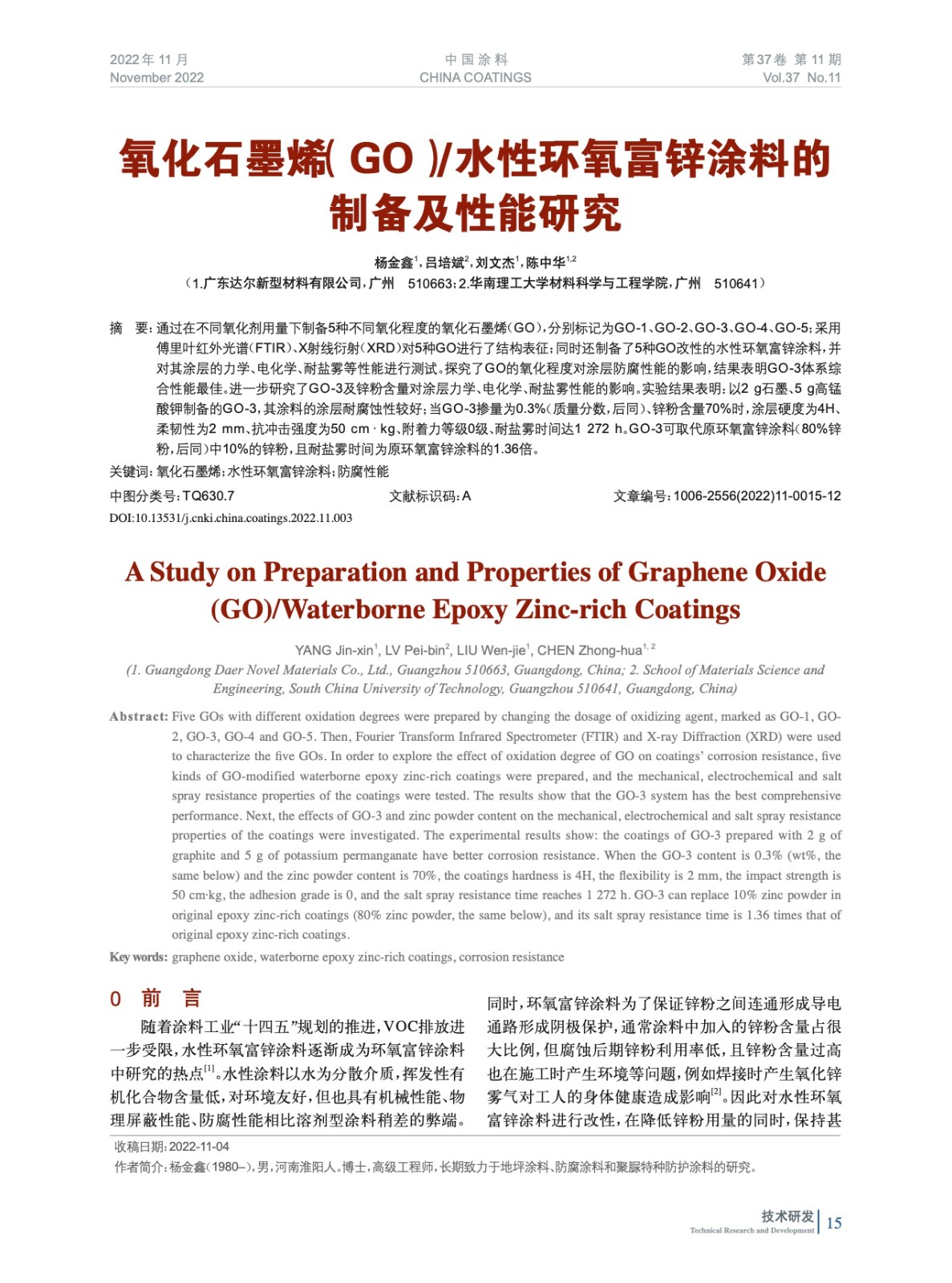 氧化石墨烯(GO)/水性環(huán)氧富鋅涂料的制備及性能研究