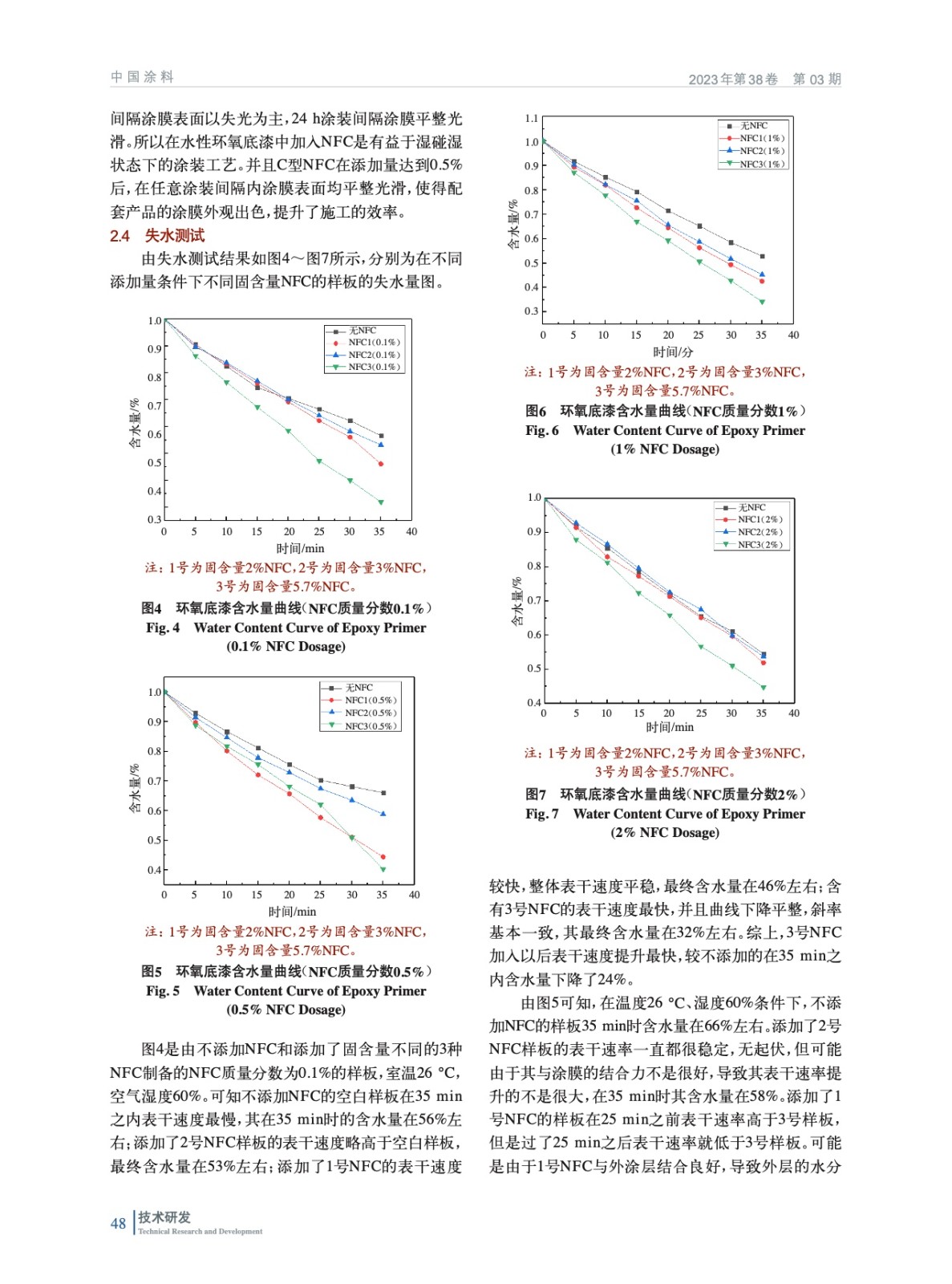 摘要:采用3種固含量不同的納米纖維素(NFC)對涂膜進行改性,利用納米纖維素的結(jié)構(gòu)特點,在水性環(huán)氧底漆濕膜中形成通道效應(yīng),加速底漆中水的揮發(fā)。考察了涂膜中NFC添加量變化對其干燥速度、耐鹽霧性、附著力、耐沖擊性、表面張力的影響。研究發(fā)現(xiàn),在水性環(huán)氧底漆中引入新型的納米纖維素材料后,可以加快干燥過程中的水分揮發(fā)速率,使其快速表干。同時,隨著NFC添加量的增加,涂膜的耐鹽霧性、附著力、抗沖擊等性能逐漸提升,最終發(fā)現(xiàn)當(dāng)固含量為5.7%NFC添加量為0.5%(質(zhì)量分?jǐn)?shù))的時候涂膜的各項性能達到最佳。滿足水性環(huán)氧底漆快速表干的條件,并能適應(yīng)“濕碰濕”涂裝需求,大大降低了涂裝間隔時間,復(fù)合涂層涂膜外觀出色。