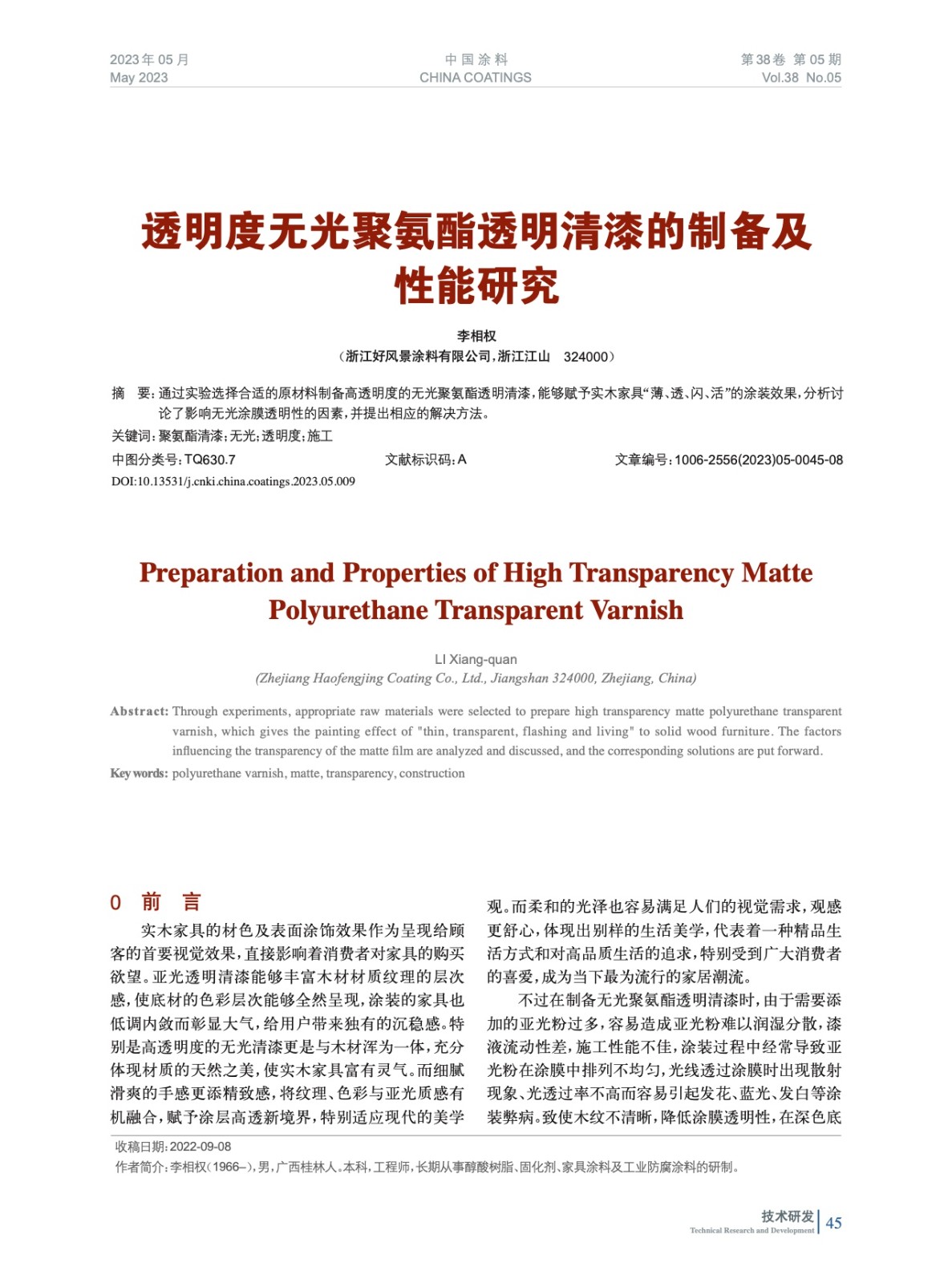 透明度無光聚氨酯透明清漆的制備及性能研究