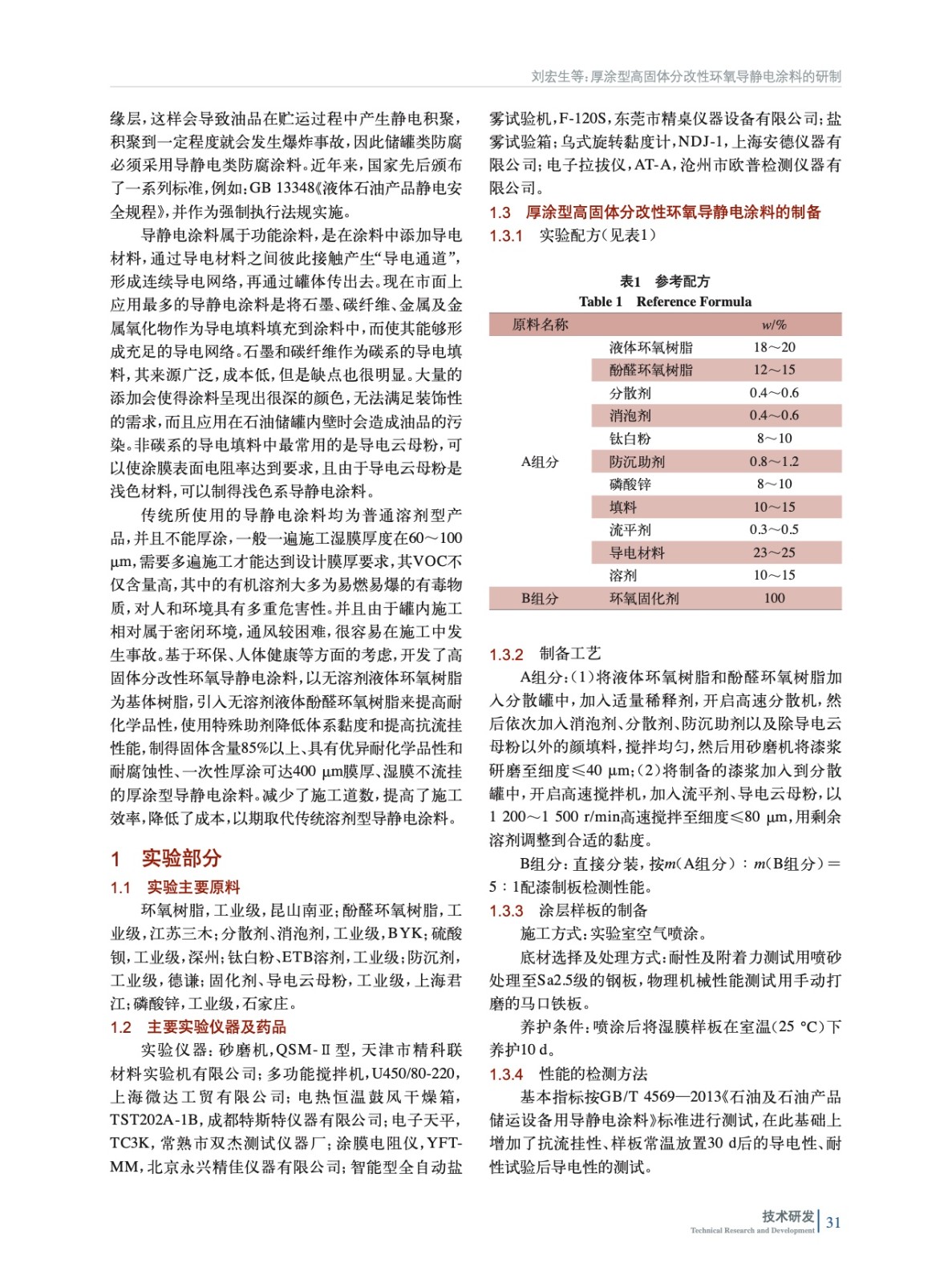 摘要:以液體雙酚A環(huán)氧樹脂和液體酚醛環(huán)氧樹脂為基料,以環(huán)境友好型稀釋劑為溶劑,在功能性導(dǎo)電材料、顏填料和助劑的配合下制備成厚涂型高固體分改性環(huán)氧導(dǎo)靜電涂料,并對(duì)涂膜的性能進(jìn)行檢測(cè)。結(jié)果表明,采用噴涂施工時(shí),一次性厚涂濕膜400 μm不流掛;實(shí)干后,表面電阻率可達(dá)到106~108 Ω;且涂膜具有優(yōu)良的耐油性、耐鹽霧性、耐化學(xué)品性;經(jīng)耐性測(cè)試后,其導(dǎo)電性衰減量很小。