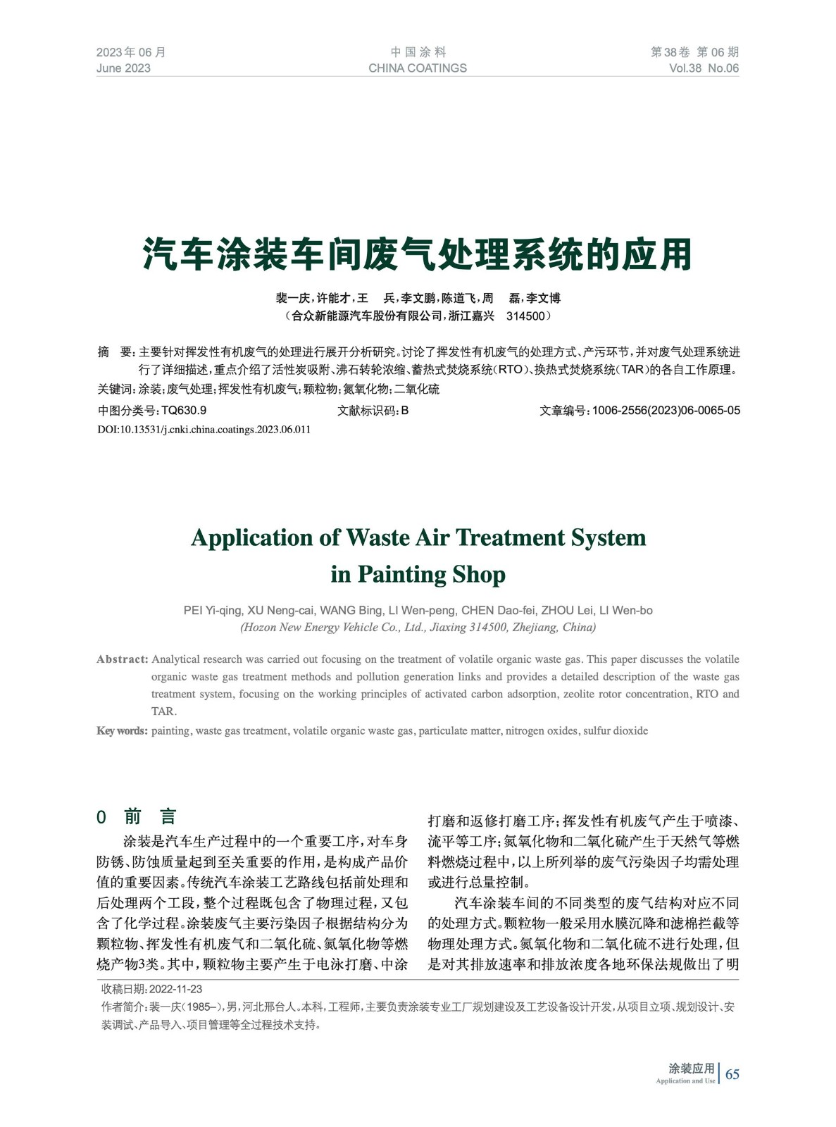 汽車涂裝車間廢氣處理系統(tǒng)的應(yīng)用