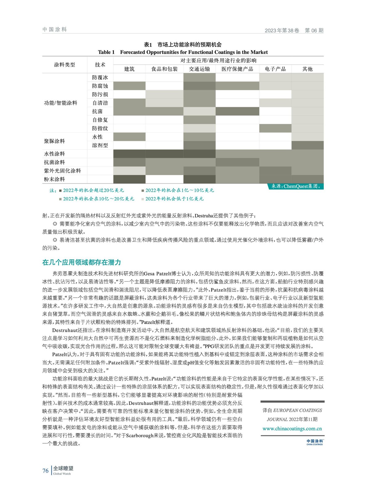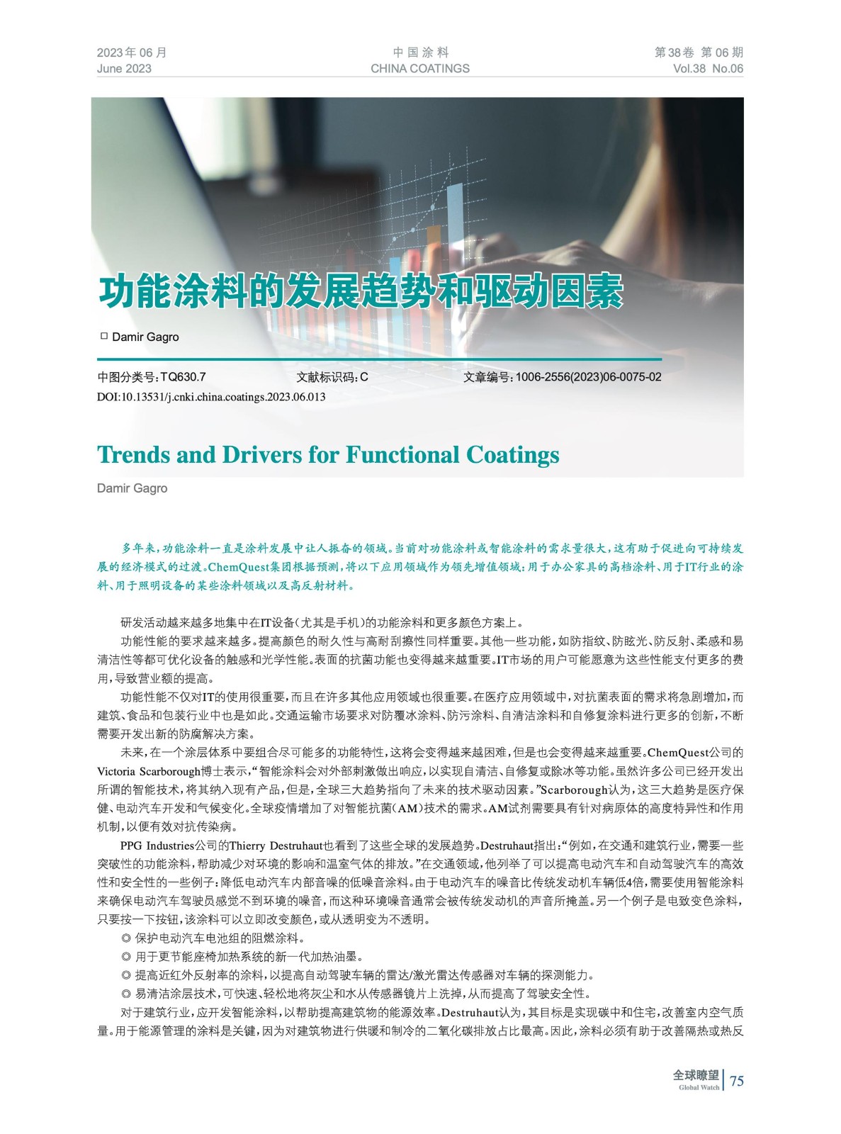 摘要:多年來,功能涂料一直是涂料發(fā)展中讓人振奮的領(lǐng)域。當(dāng)前對(duì)功能涂料或智能涂料的需求量很大,這有助于促進(jìn)向可持續(xù)發(fā)展的經(jīng)濟(jì)模式的過渡。ChemQuest集團(tuán)根據(jù)預(yù)測(cè),將以下應(yīng)用領(lǐng)域作為領(lǐng)先增值領(lǐng)域:用于辦公家具的高檔涂料、用于IT行業(yè)的涂料、用于照明設(shè)備的某些涂料領(lǐng)域以及高反射材料。