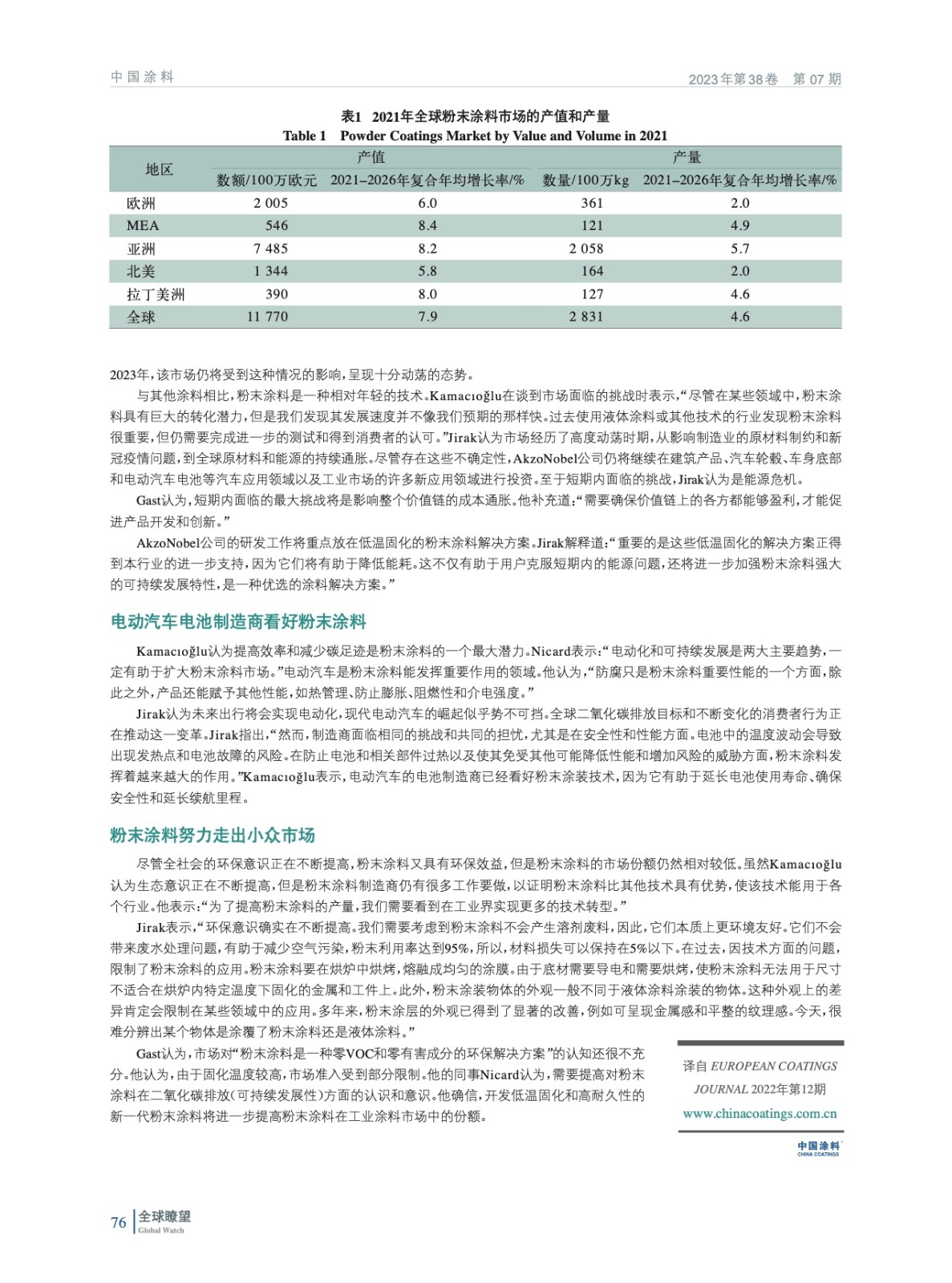 一般而言,粉末涂料市場在2020年達到了新冠疫情期的低點,但在2021年出現了良好反彈。最大的挑戰過去是現在仍是原材料的價格和短缺。盡管存在這些挑戰,但是由于持續不斷的可持續發展趨勢,粉末涂料的全球前景仍然呈現一個樂觀的態勢。