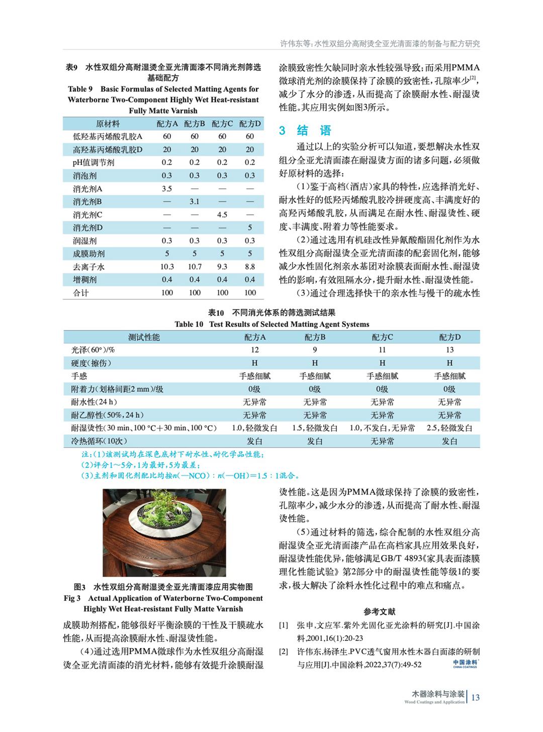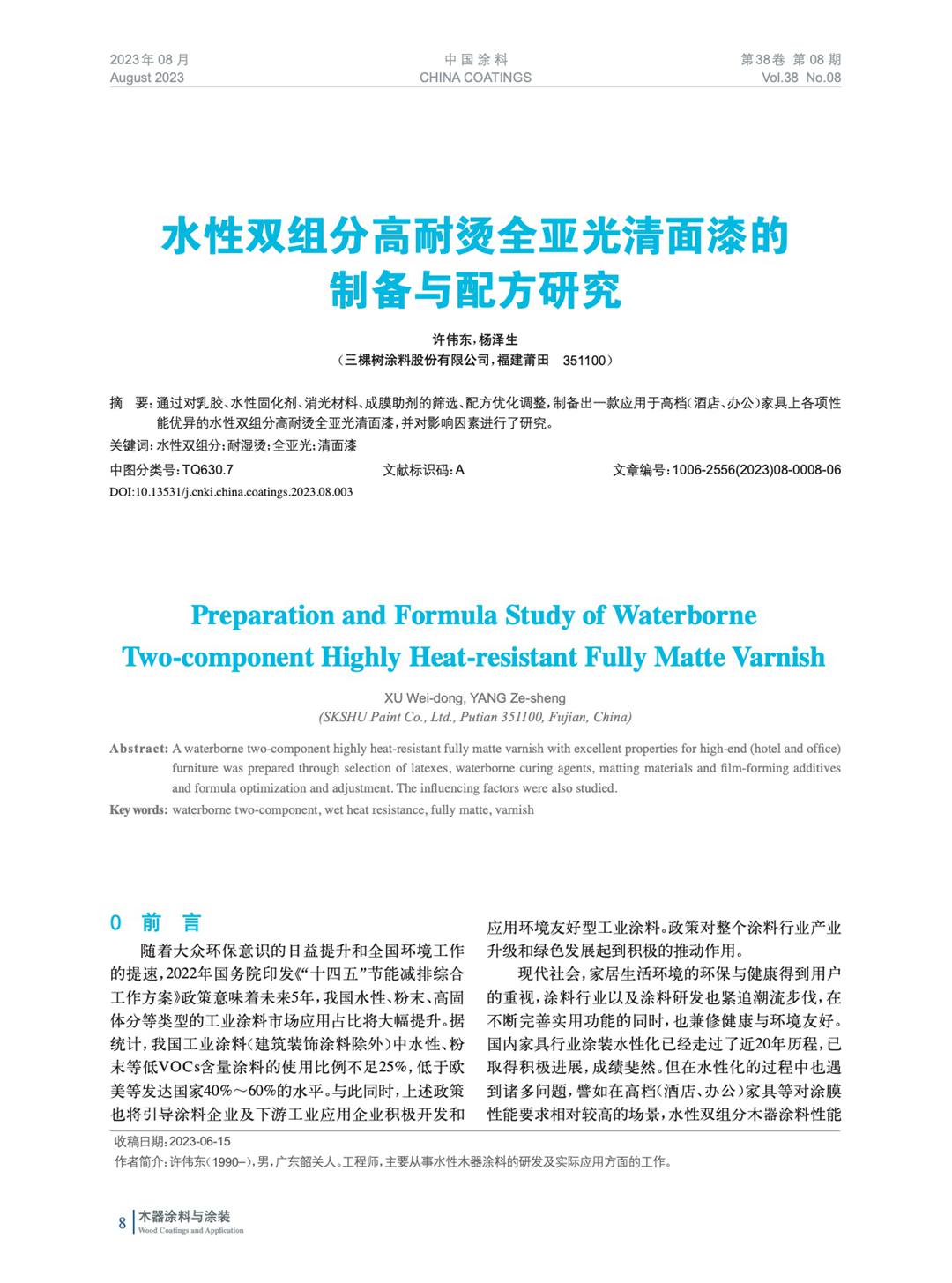 通過對乳膠、水性固化劑、消光材料、成膜助劑的篩選、配方優化調整,制備出一款應用于高檔(酒店、辦公)家具上各項性能優異的水性雙組分高耐燙全亞光清面漆,并對影響因素進行了研究。