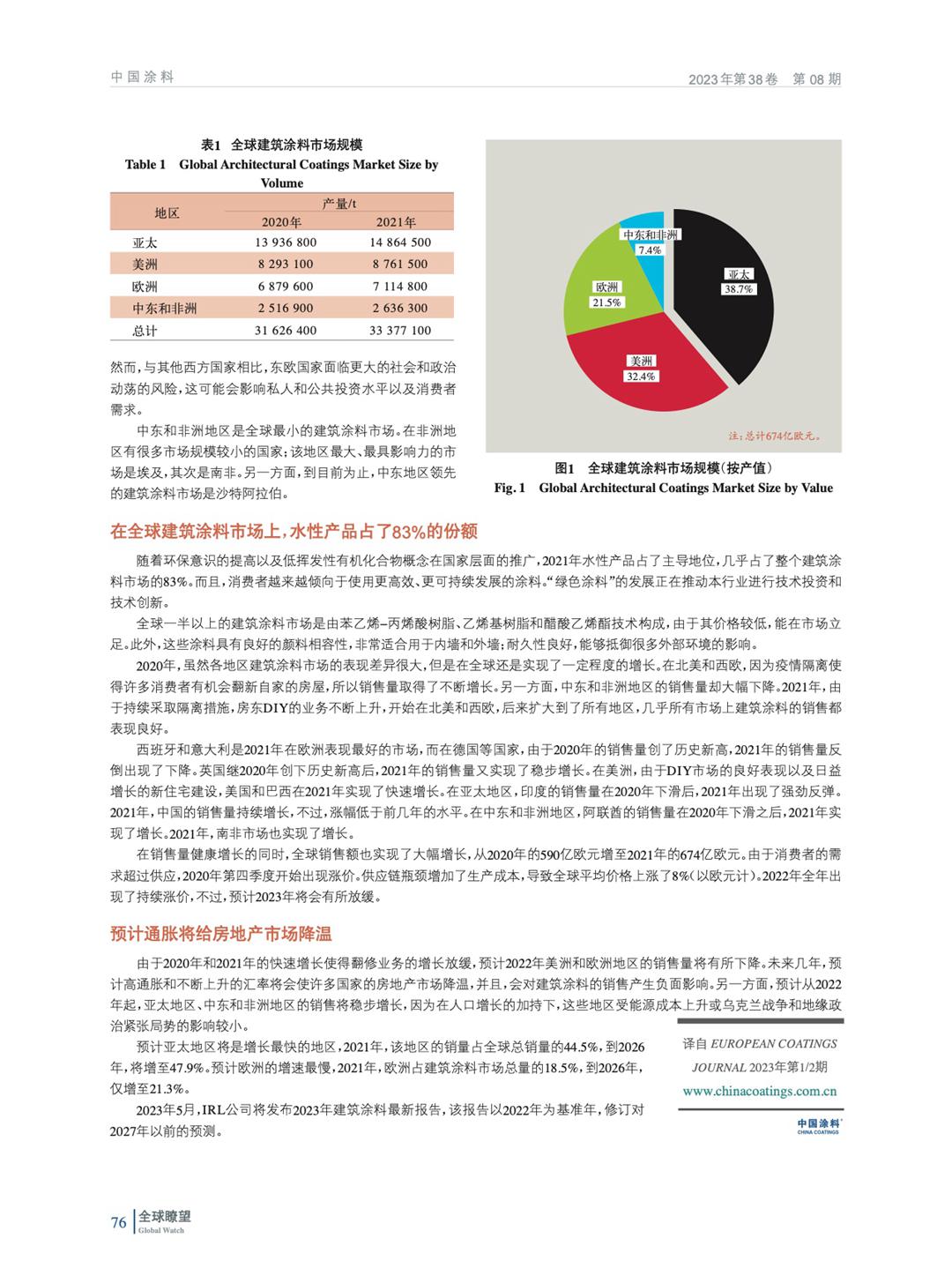 2022年5月,IRL公司完成了建筑涂料的年度報告計劃。根據IRL公司的研究,2021年全球建筑涂料市場銷售量約為3 340萬,假設全球平均價格為2.02歐元/kg,那么市場的銷售額為674億歐元。