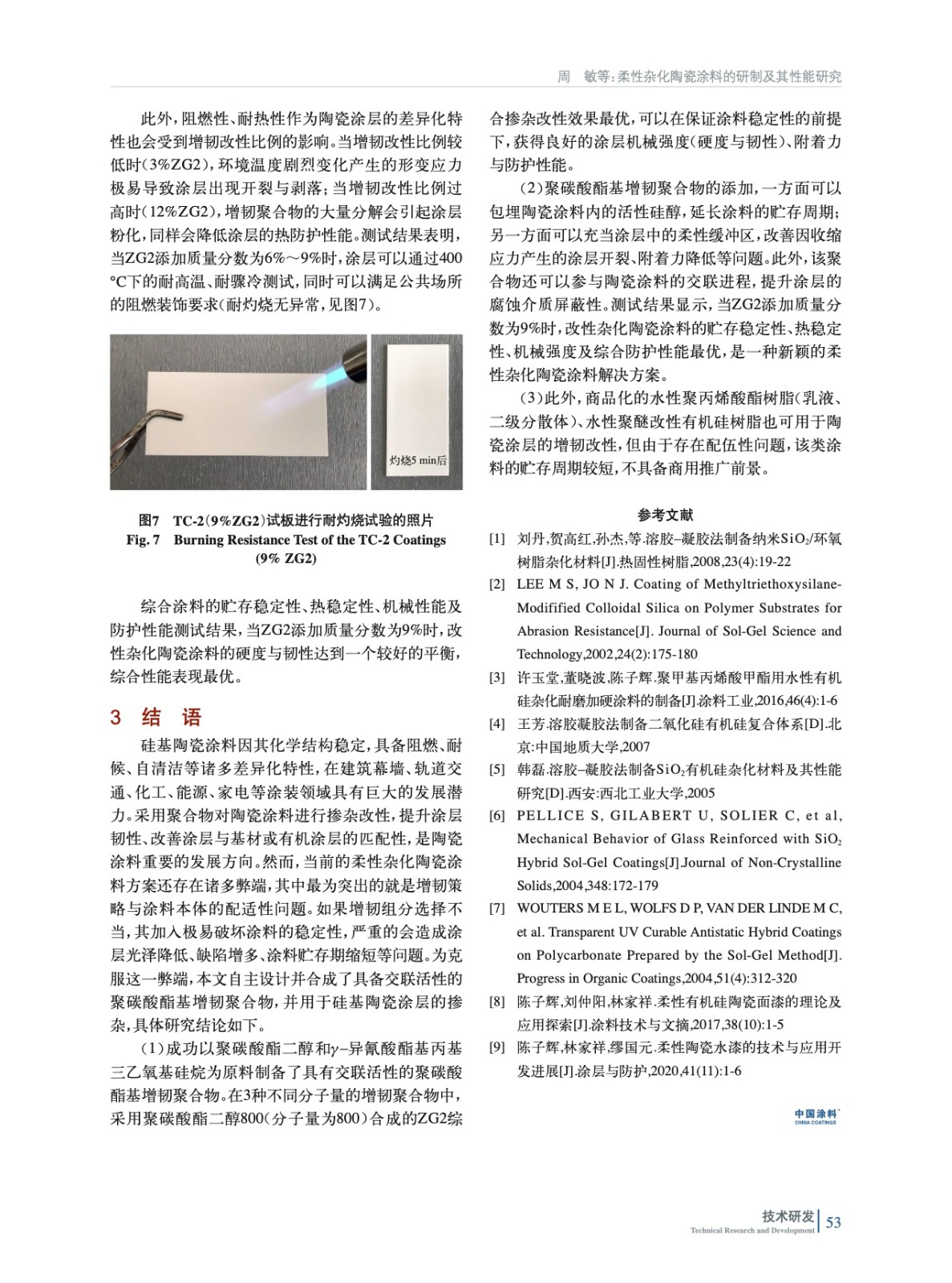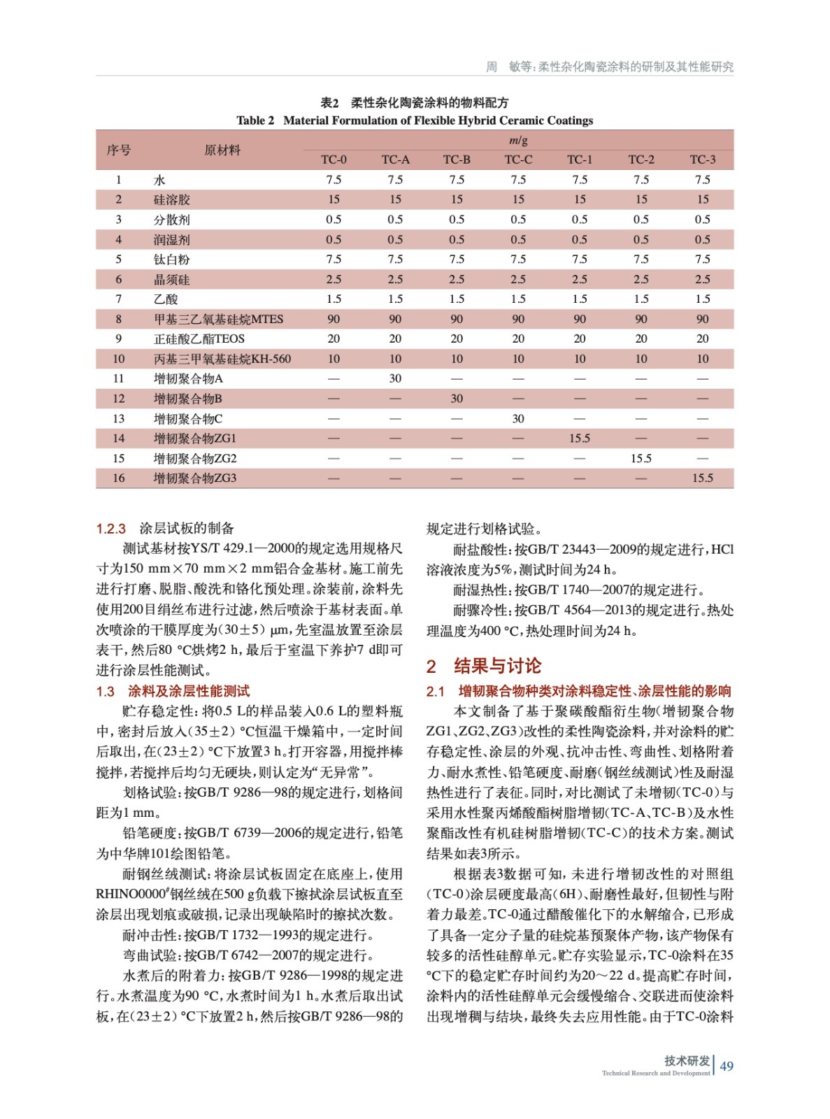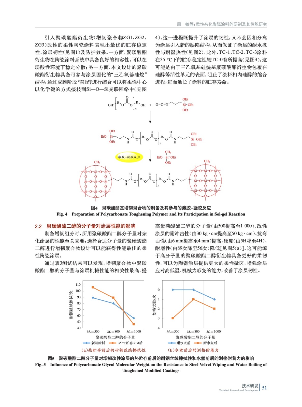 摘要:以聚碳酸酯二醇和γ–異氰酸酯基丙基三乙氧基硅烷為原料,制備了具有良好硅烷相容性與貯存穩(wěn)定性的活性增韌聚合物ZG2,并將其應(yīng)用于陶瓷涂料的柔性改性。實(shí)驗(yàn)結(jié)果顯示,聚碳酸酯基增韌聚合物ZG2的摻雜,一方面可以包埋涂料中的活性硅醇,延長涂料的貯存周期;另一方面可以充當(dāng)涂層中的柔性緩沖區(qū),改善因收縮應(yīng)力而產(chǎn)生的涂層開裂、附著力低等問題。此外,ZG2還可以參與陶瓷涂料的交聯(lián)進(jìn)程,提升涂層的腐蝕介質(zhì)屏蔽性。當(dāng)ZG2的摻雜質(zhì)量分?jǐn)?shù)為9%時,所得改性雜化陶瓷涂料的貯存穩(wěn)定性、熱穩(wěn)定性、機(jī)械強(qiáng)度及綜合防護(hù)性能最優(yōu),具備市場化推廣潛力。