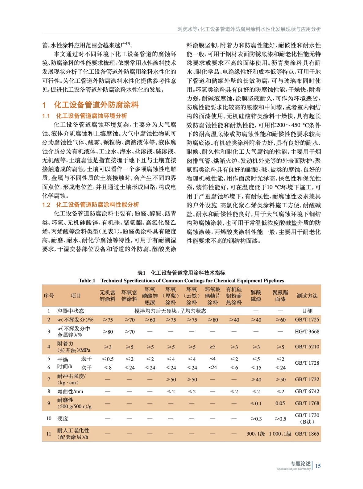對不同環境下化工設備管道的腐蝕環境、外防腐用涂料的性能要求及水性化的可行性進行分析,對化工設備管道外防腐用水性涂料的技術發展現狀進行介紹,對水性涂料在化工設備管道外防腐領域的推廣應用存在的問題進行闡述,并對未來發展進行展望。