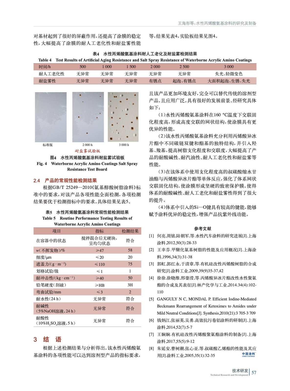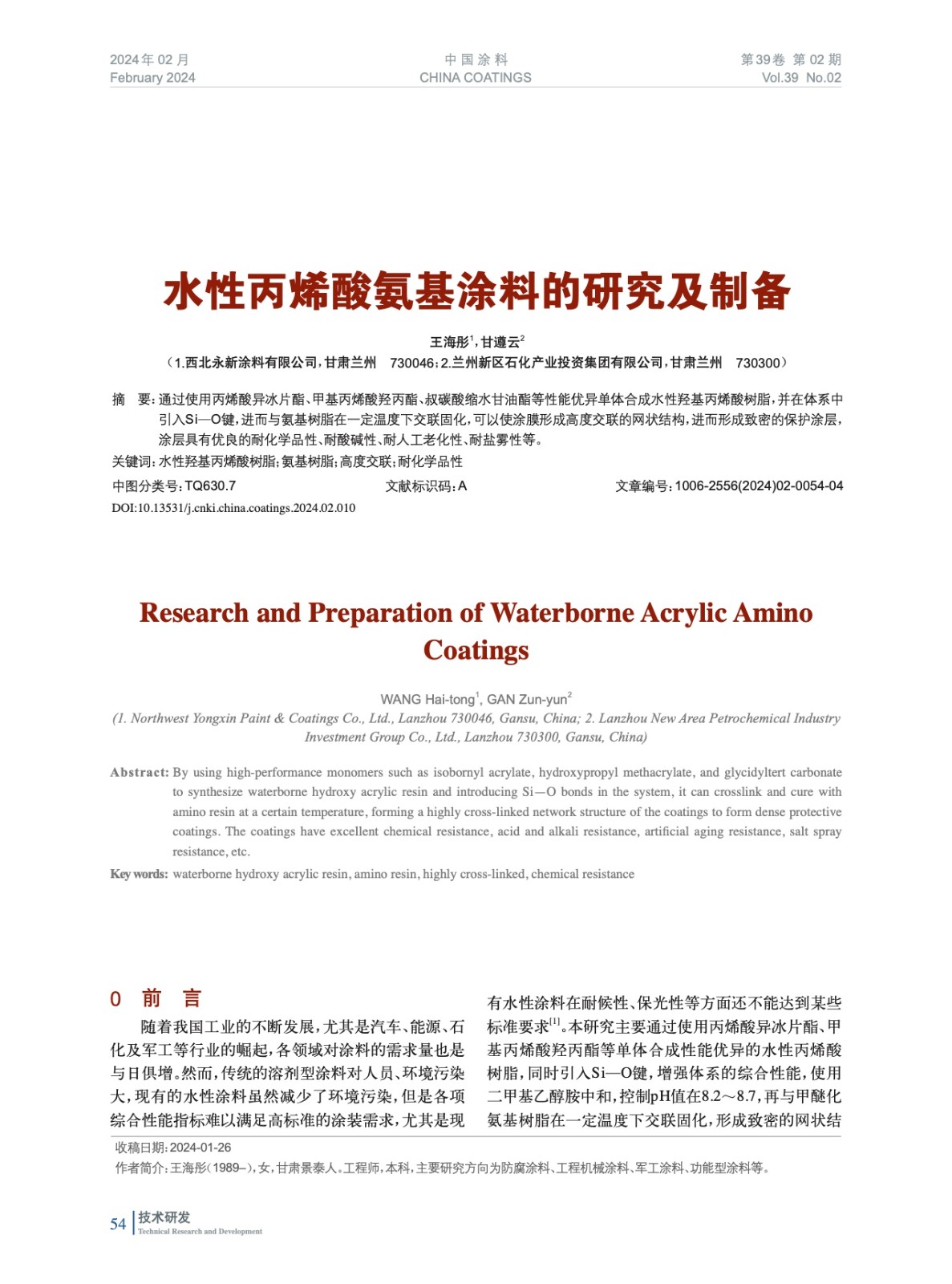 摘要:通過使用丙烯酸異冰片酯、甲基丙烯酸羥丙酯、叔碳酸縮水甘油酯等性能優(yōu)異單體合成水性羥基丙烯酸樹脂,并在體系中引入Si—O鍵,進而與氨基樹脂在一定溫度下交聯(lián)固化,可以使涂膜形成高度交聯(lián)的網(wǎng)狀結構,進而形成致密的保護涂層,涂層具有優(yōu)良的耐化學品性、耐酸堿性、耐人工老化性、耐鹽霧性等。