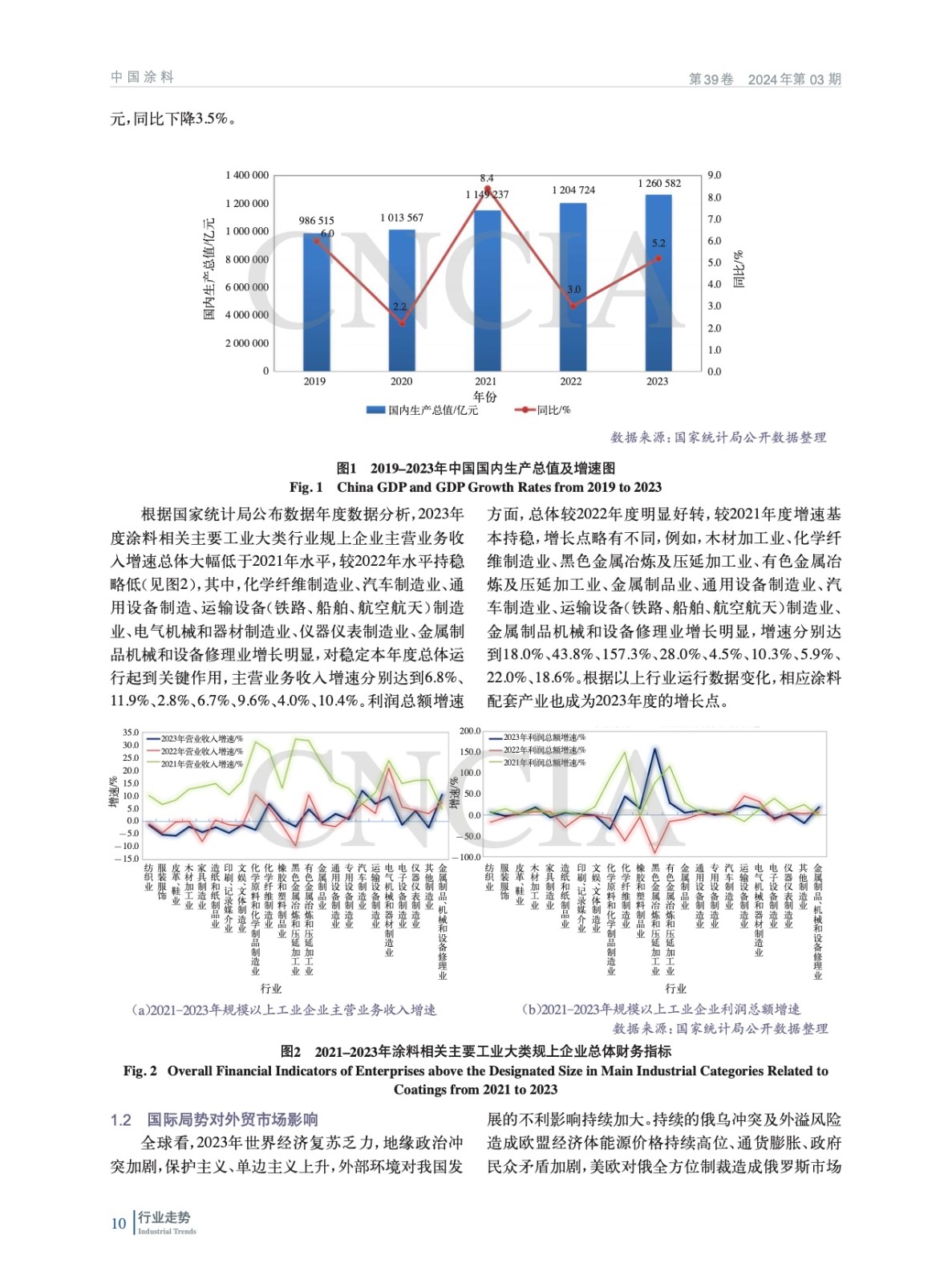 摘要:簡(jiǎn)析了2023年中國(guó)宏觀經(jīng)濟(jì)及外部環(huán)境發(fā)展情況,概括介紹了2023年涂料重點(diǎn)下游、新興領(lǐng)域發(fā)展概況及對(duì)涂料行業(yè)的影響,重點(diǎn)分析了2023年度中國(guó)涂料行業(yè)發(fā)展和進(jìn)出口情況,并對(duì)上游鈦白粉、氧化鐵、丙烯酸乳液和環(huán)氧樹(shù)脂領(lǐng)域發(fā)展情況進(jìn)行了概述。最后對(duì)中國(guó)涂料行業(yè)特征和發(fā)展趨勢(shì)進(jìn)行了分析和預(yù)測(cè)。
