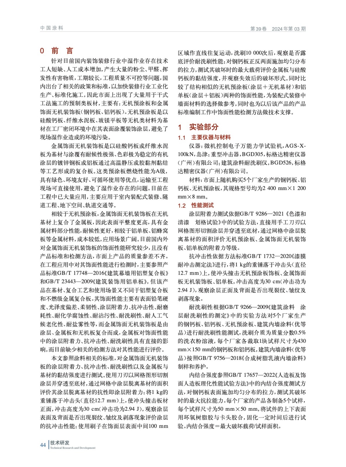 摘要:參照涂料相關的標準研究了金屬飾面無機裝飾板主要飾面性能及金屬板與無機板的黏結強度。結果表明:金屬飾面無機裝飾板具有卓越的涂層附著力、抗沖擊性能,涂層附著力等級為0級,切割邊緣完全平滑、網格內無脫落。30 cm高度的沖擊后,涂層未出現開裂,背面硅酸鈣板未出現凸起和裂紋,與金屬材料鋁單相當,可以替代部分鋁單板、搪瓷板,應用于軌道交通樞紐站、過街隧道等,以降低工程成本。由于成膜方式為化學成膜,洗刷10 000次后,金屬飾面無機裝飾板的飾面層中間100 mm長度的洗刷區無明顯凹痕;參照GB/T 17657—2022中的內結合強度方法測試金屬板與無機板之間的黏結強度,具有一定的可行性,金屬板與無機基材黏結處強度均在0.54 MPa以上,滿足室內環境下黏結面強度要求。